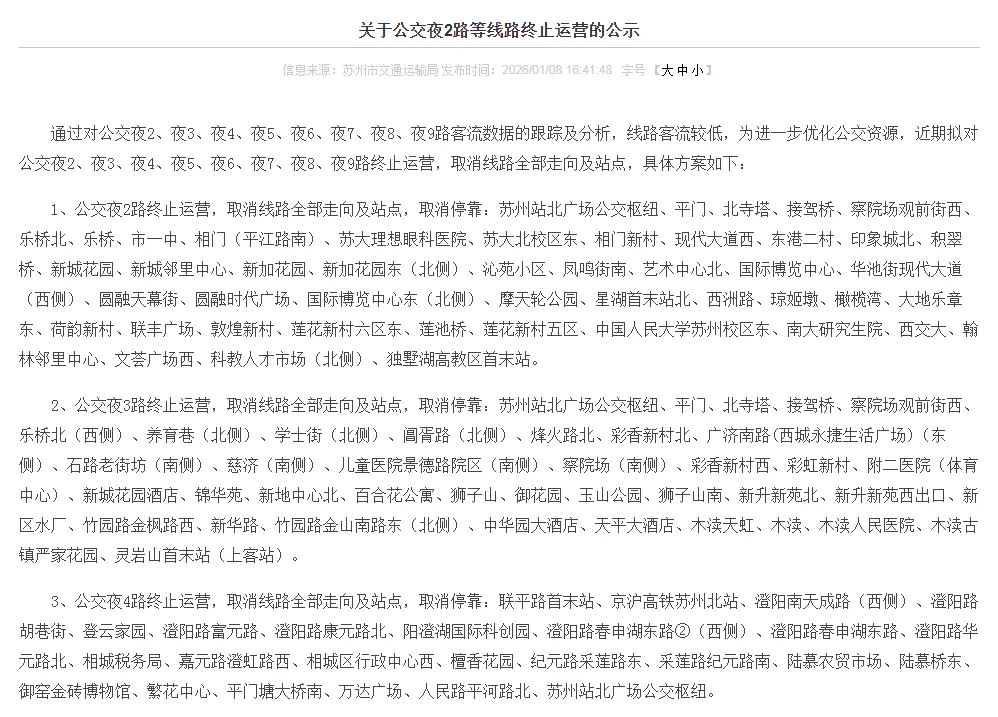 夜幕降临,苏州城区的公交线路图正在悄然发生变化。自2025年11月以来,苏州市交通运输局陆续发布两条公示,拟对公交夜1路至夜9路等共计9条夜间线路终止运营。