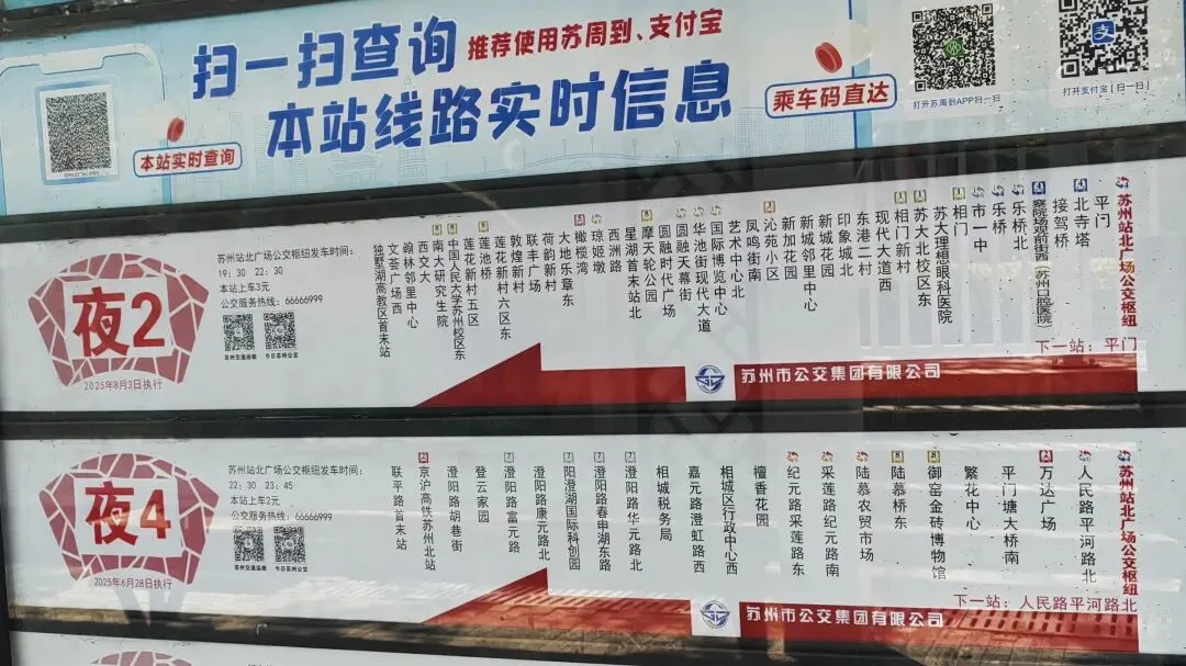 对普通乘客而言,如果这些公示正式执行,这将意味着一夜之间,城市为他们提供的安全、平价归家选择将消失。公交夜1路和夜5路的站点图清晰地显示,这些线路串联起了苏州火车站与城市多个方向的居住区。