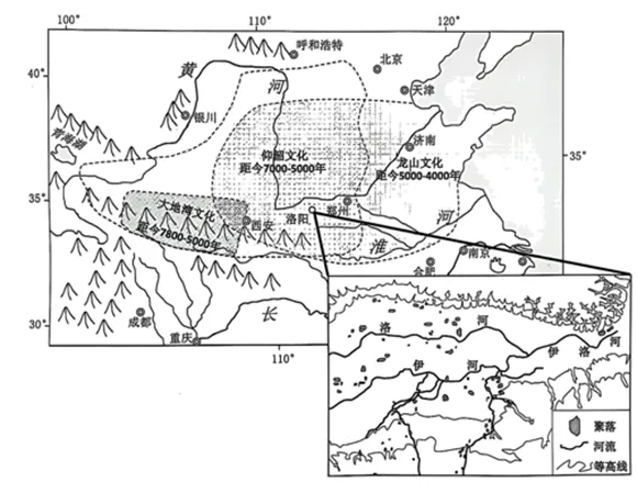 材料二:图为“中国新石器时代主要文化区的地理分布略图”及“洛阳盆地仰韶文化聚落遗址分布略图”。