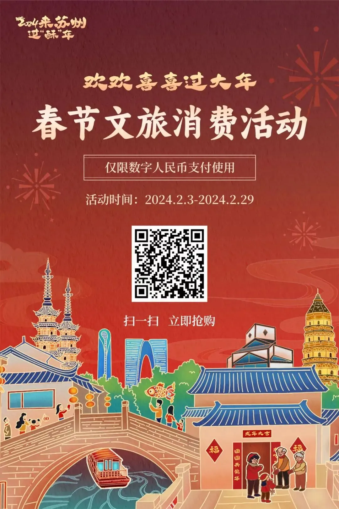 第一重体验,赶“龙年大集”。春节期间,平江路、观前街、山塘街、葑门横街等苏州老街上,老字号牵手新潮流,非遗文化传承人正等着与你现场互动;虎丘庙会、周庄“打春牛”、震泽“迎财神”、胥口“抬猛将”等春节民俗,等你前来打卡。