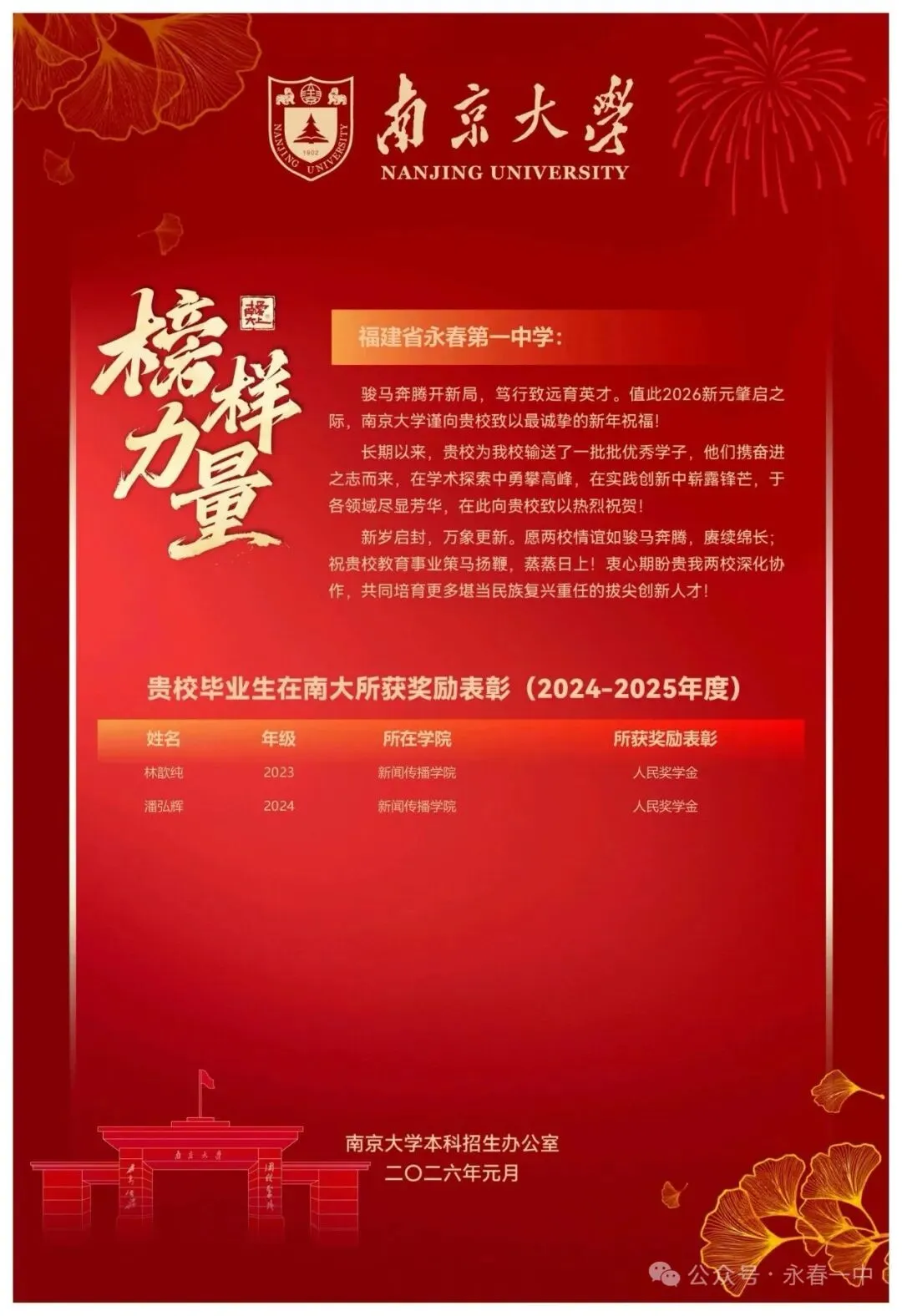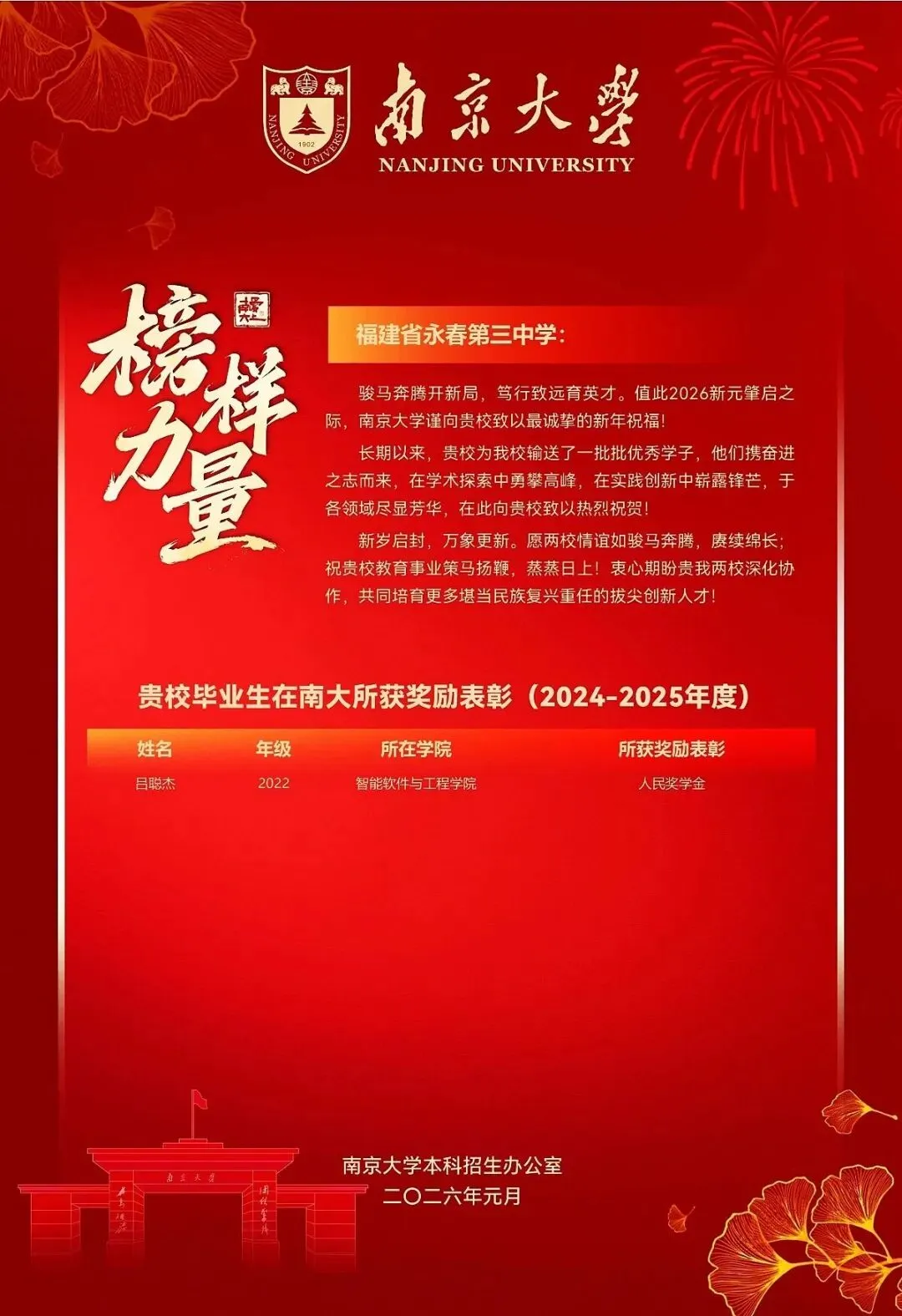 南京大学向永春一中发来喜报