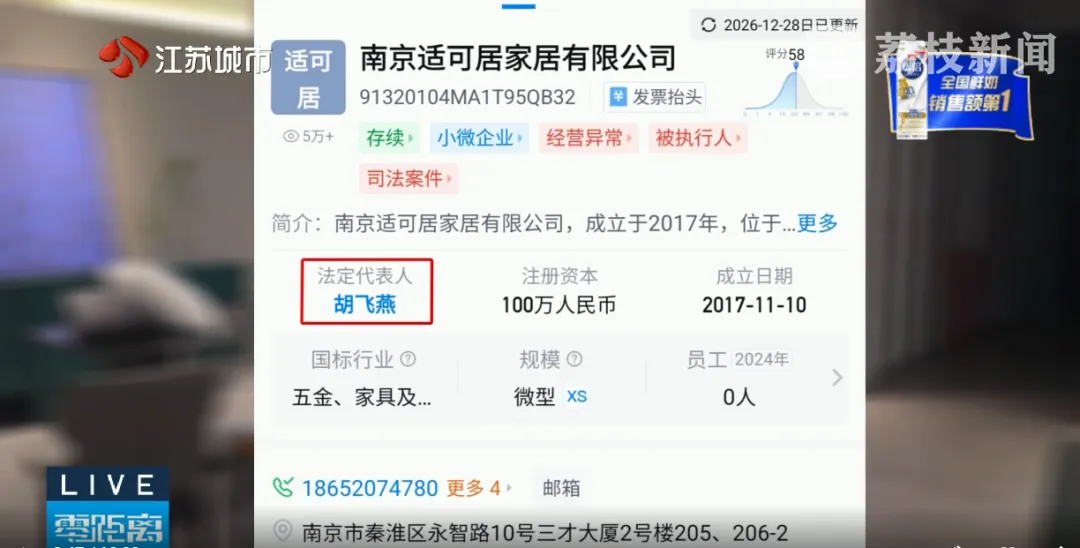 签约主体分为两家公司,一部分业主和注册在栖霞区燕子矶街道的南京凡简家居软装有限公司签订合同,另一部分则和注册在秦淮区的南京适可居家居有限公司签约,而这两家公司的法定代表人,都是胡飞燕。