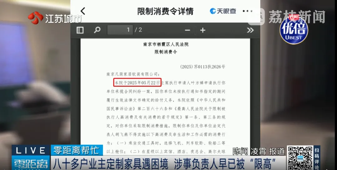零距离记者通过天眼查进一步查询发现,两家公司涉及的合同纠纷涉诉案件多达24起,还有多起被执行案件,更关键的是,早在去年5月22日,法定代表人胡飞燕就已经被限制高消费。