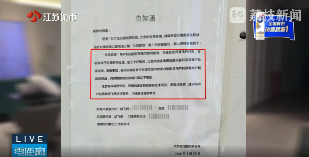 业主们拿出了商场方在1月22日张贴的告知函,函件中写明:“凡简家居”存在拖欠租金和物业管理费等违约行为,商场已经对其进行断电处理。对于已经缴纳定金但没提货、没安装的顾客,商场建议大家联系商户负责人胡飞燕和方芳沟通处理。