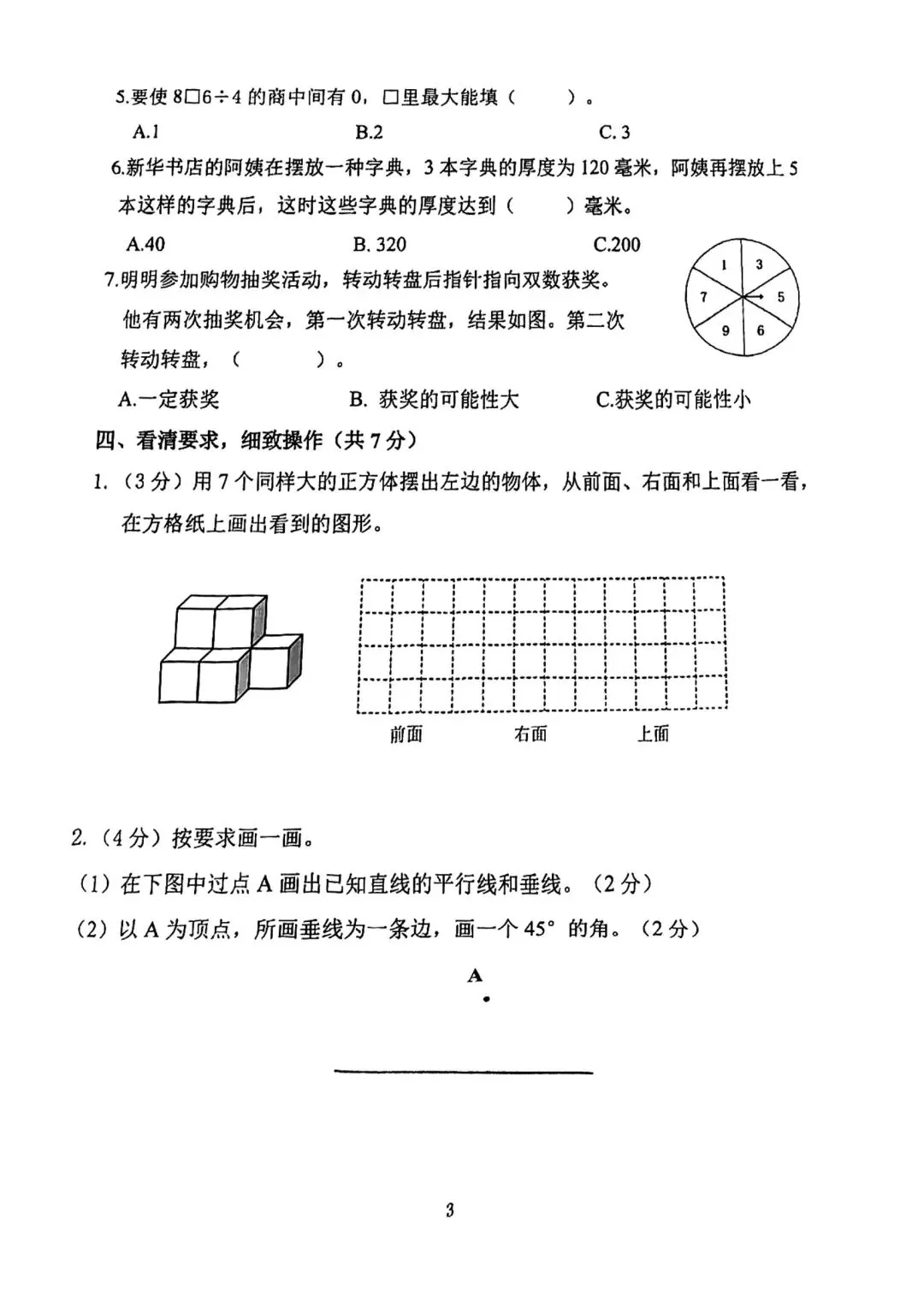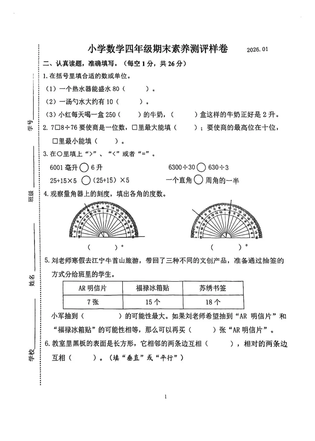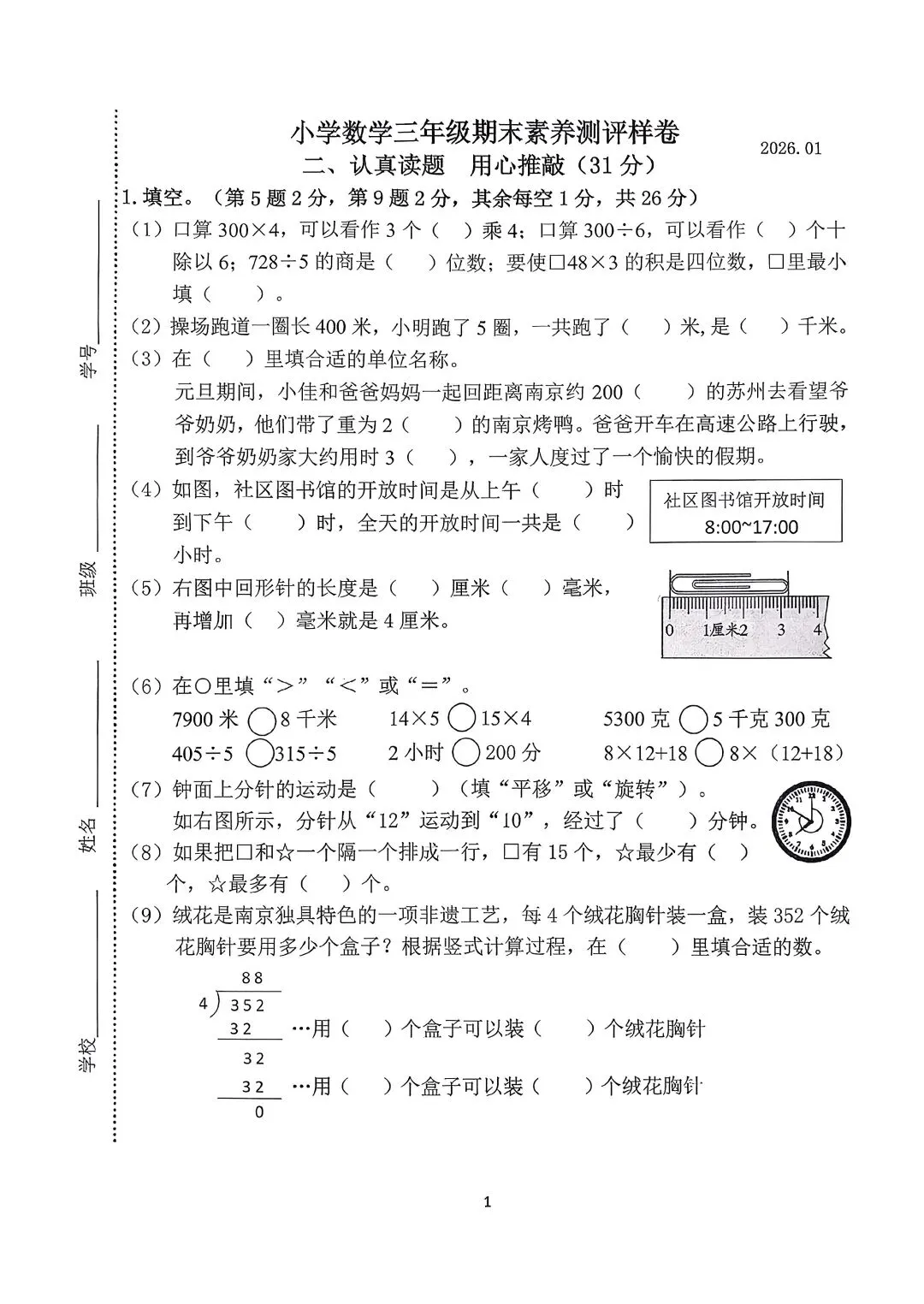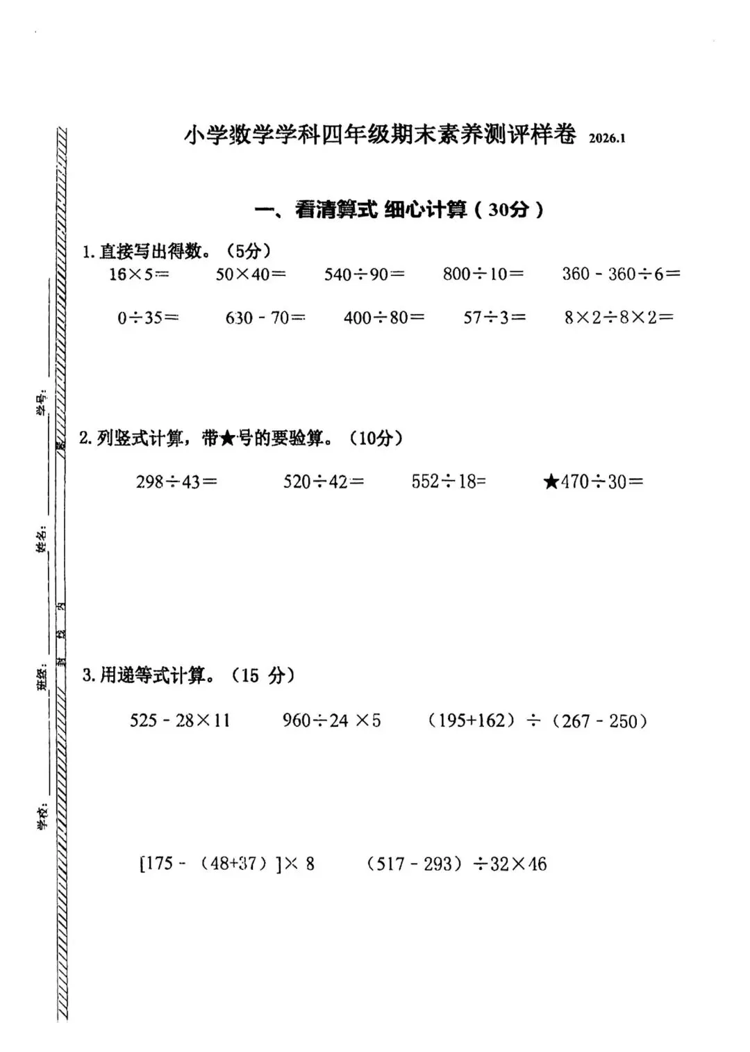 >南京江宁2026三四年级上册今天才考数学期末卷!