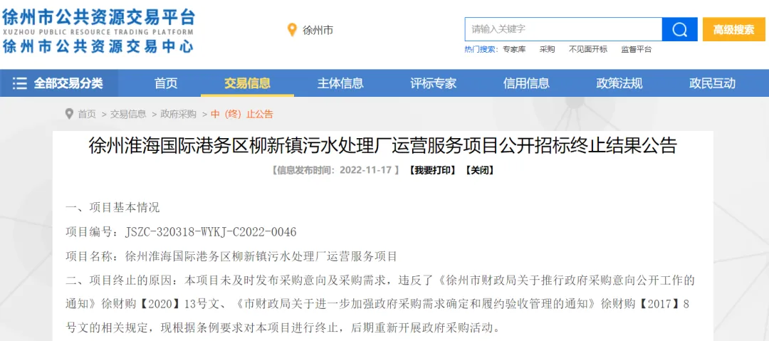 据中国水网了解到,柳新镇污水处理厂运营服务项目于2022年11月9日发布招标公告,2022年11月17日发布招标终止公告,项目终止原因为项目未及时发布采购意向及采购需求,违反了《徐州市财政局关于推行政府采购意向公开工作的通知》徐财购【2020】13号文、《市财政局关于进一步加强政府采购需求确定和履约验收管理的通知》徐财购【2017】8号文的相关规定,现根据条例要求对本项目进行终止,后期重新开展政府采购活动。