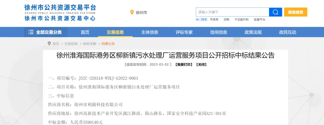 2022年12月22日重新启动招标,今年3月2日,发布中标结果公告,供应商为徐州市利源科技有限公司。服务范围为:(1)污水厂设施设备及泵站等的日常维修、更换、养护以及管理和运行服务;(2)污水处理厂管理档案、资料;(3)法规和政策规定及授权的其它事项。
