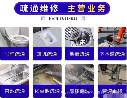 疏通下水道:家庭、酒店、饭店、店铺等各类下水管道疏通。