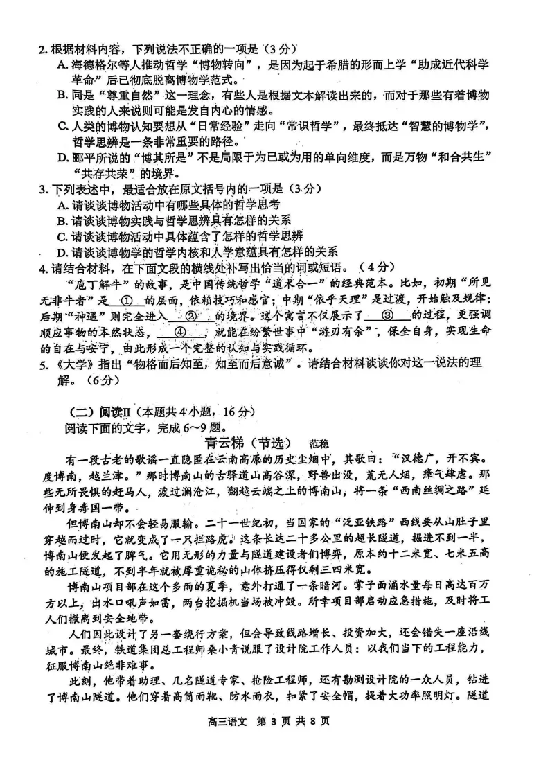 材料围绕“博物学与哲学的关系”展开,涉及中西哲学、生态伦理、认知科学等多学科知识,理论深度较大。题目设问虽未超出文本范畴,但要求学生具有较强的逻辑梳理与概念辨析能力。如第1题需准确理解三位学者的观点差异,第5题要求结合《大学》经典语句进行阐释,体现出从“理解”到“迁移”的能力梯度。该部分对学生的阅读耐力与思维严谨性提出挑战,属于试卷中难度较高的板块。