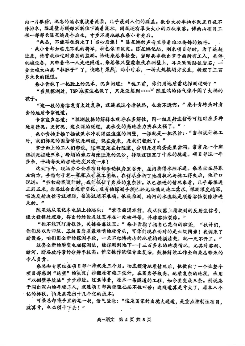 小说《青云梯》节选以铁路建设为背景,塑造了以桑小青为代表的坚韧、智慧、有担当的当代工程师形象。文本情节紧凑,人物鲜明,主题突出“家国情怀”与“工匠精神”。题目设计兼顾内容理解与艺术手法赏析,如第8题要求分析人物决策动机,第9题需结合文本细节阐释“家国情怀”,既考查信息整合能力,也引导学生在文学阅读中体悟时代精神。难度适中,贴近学生认知经验。