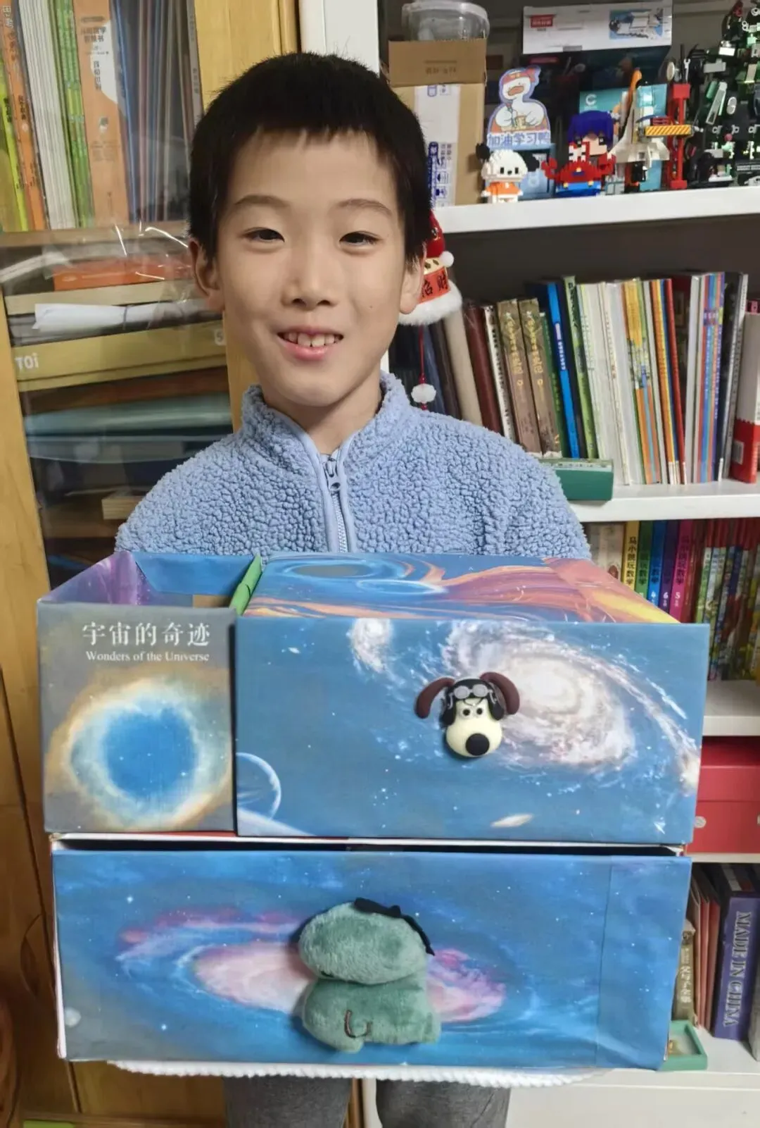 小制作“太空小宝箱”用废旧瓦楞纸折成双层壁减重抗压,利用磁铁相吸原理制作磁吸门,借助旧毛巾随机分布的纤维束防滑防震,整件作品体现了材料力学、磁学的基础原理,用最简单的材料满足了轻量、稳固、防滑的要求。