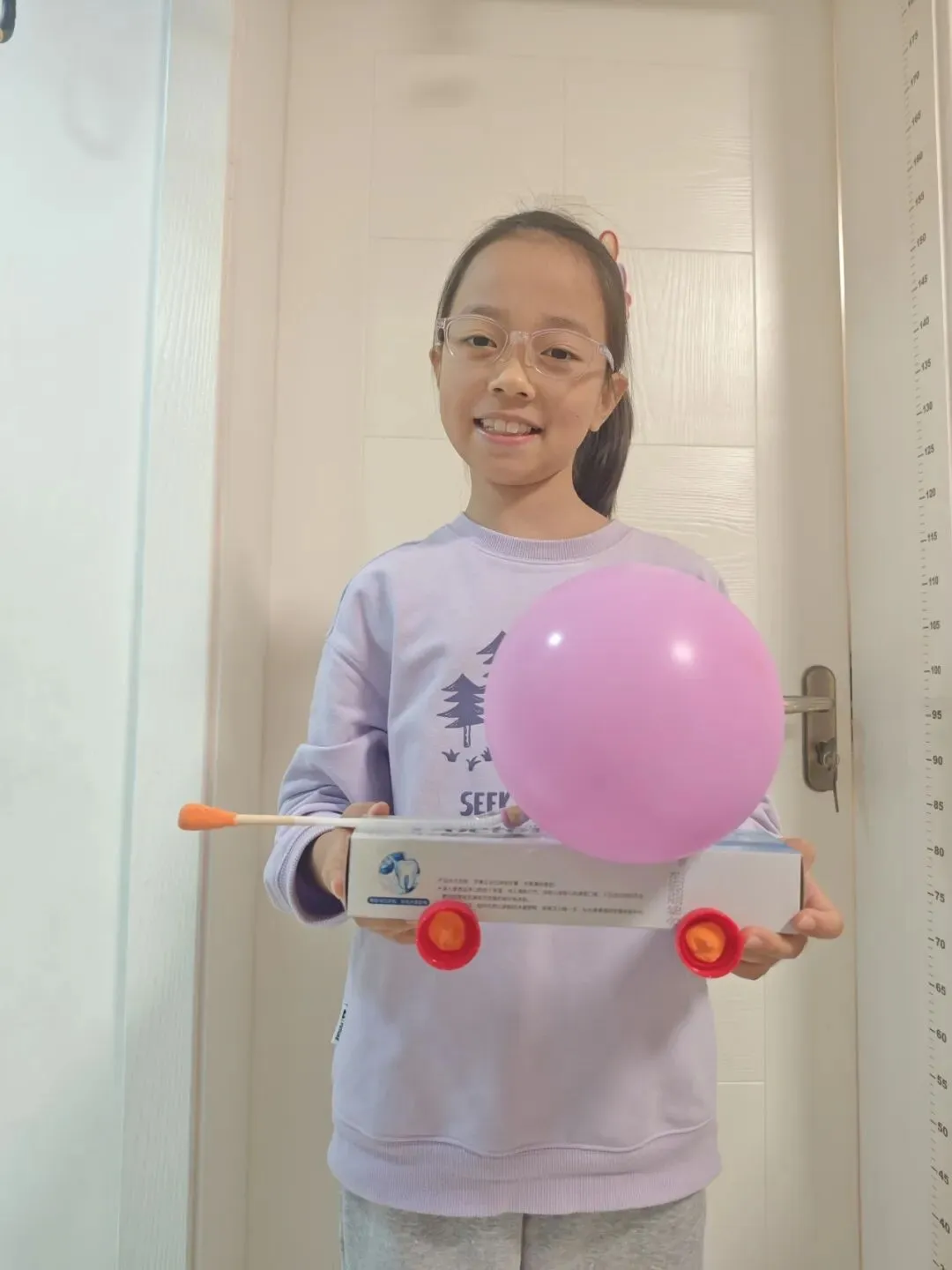 我的作品巧妙利用废旧牙膏盒、瓶盖、气球等材料制作无动力小车,将抽象的物理知识(如反冲力、摩擦力)转化为直观有趣的实践,体现科学小制作的乐趣与可行性。极大地锻炼了学生的动手能力与创新思维。