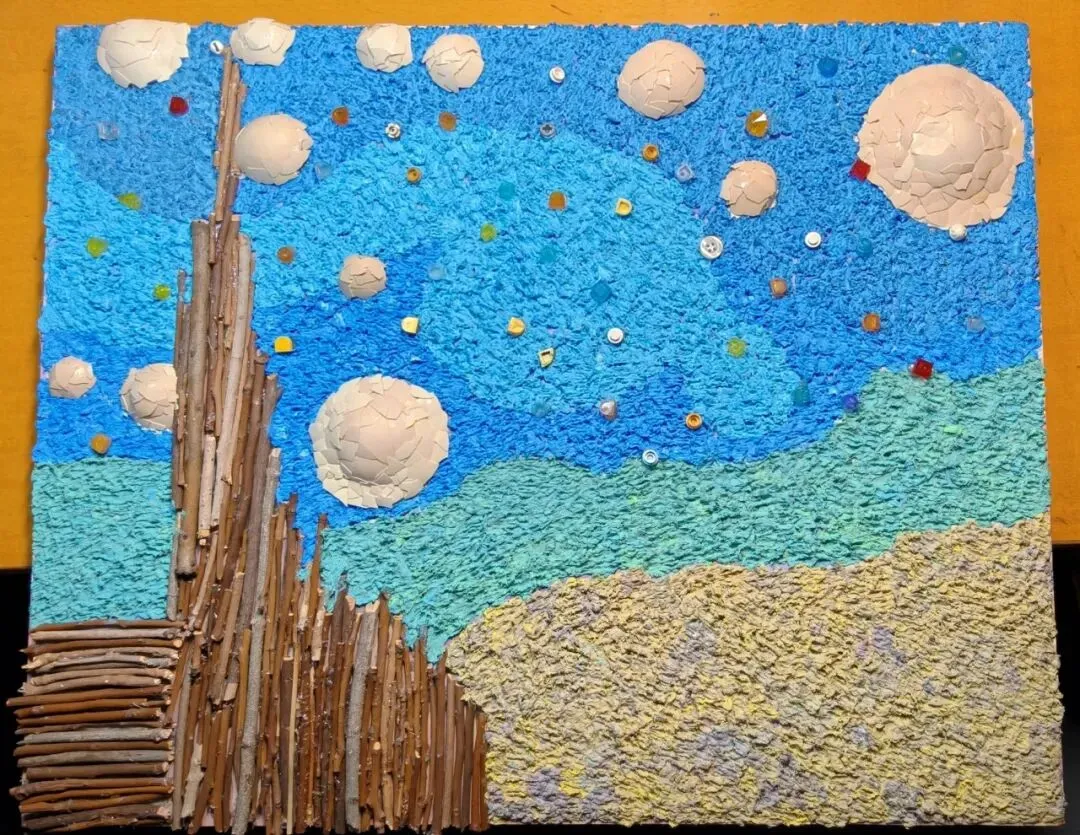 本次小制作星空是由树枝、早餐吃剩的鸡蛋壳、废弃纸巾、旧衣服上的纽扣和旧玩具上的零部件组成的。画里的大地、河流、星空、大树共同构成了一个微缩的生态系统。我想要告诉大家:保护地球,就是保护这个生态系统里每一个环节的清洁与美好,只有这样,我们才能在地球上,仰望美丽的星空。