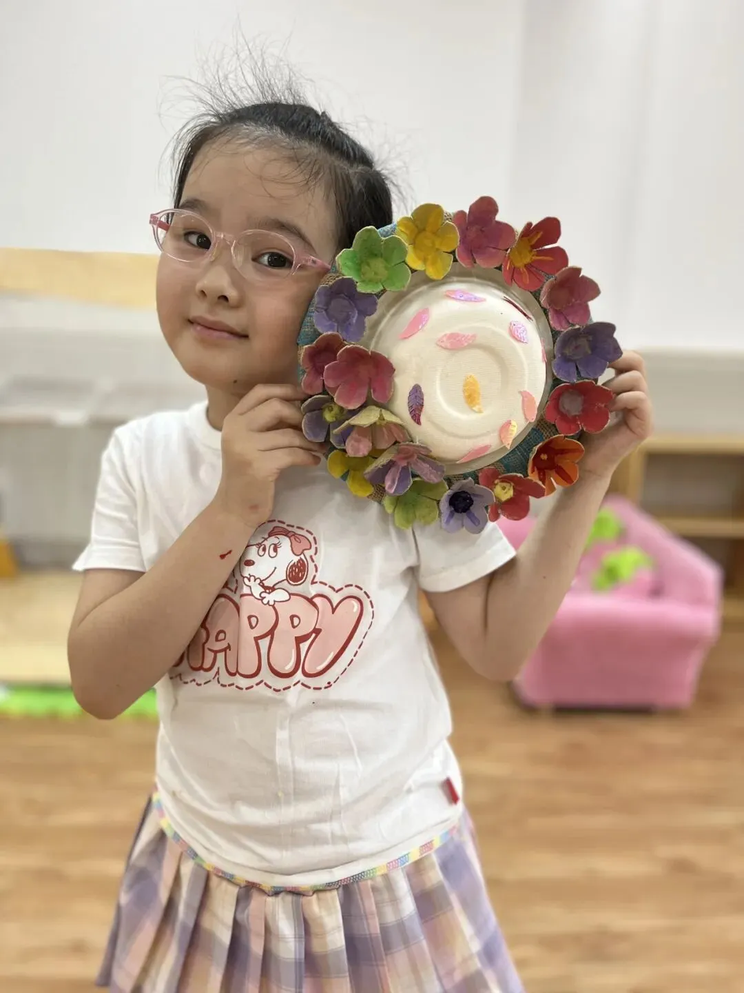 我的作品是让一个即将被丢弃的纸碗、一个鸡蛋托、一些废旧布料和绳线获得了新生,减少了垃圾的产生,这实践了“变废为宝”的环保理念。充分地发挥想象,将普通物件展现出美的一面。