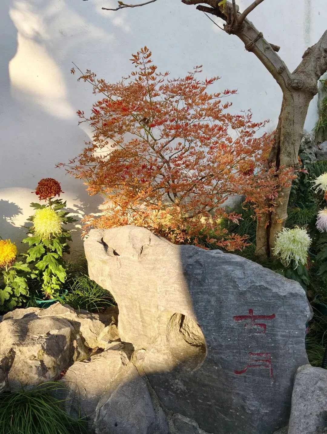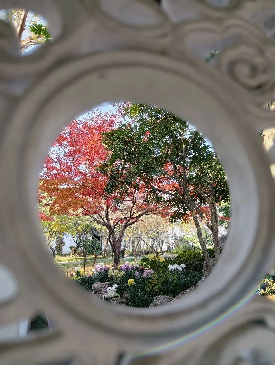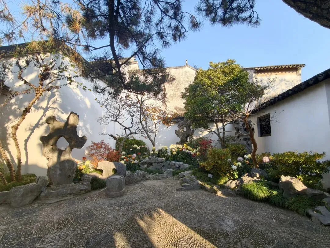 耦园中的秋色很精致。园子一角,有各色秋菊争奇斗艳;柿子树还存有稀疏的叶子,点点秋意浓;石旁的黄枫,是点睛之笔;就连晨光中的连廊,在松枝的衬托下,都透出几丝秋韵;月洞门更是被秋菊枫树青松环绕,中式园林的美感体现的淋漓尽致。 园子里摆了很多精致的盆景,这株秋菊,花朵繁茂,紫色层叠,背靠图案精美的圆窗,下面是标注有烧制人名和时间的御用黑砖,既体现中式美学,又透出中华历史底蕴。 耦园赏秋的精华,在于东西园子中的枫树和银杏,红的热烈,黄的灿烂,阳光透过枝叶,撒下斑驳光影,造出绚烂光圈,煞是好看。