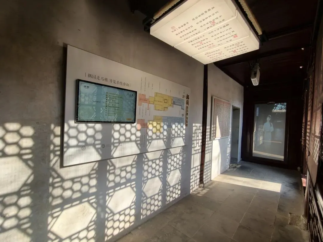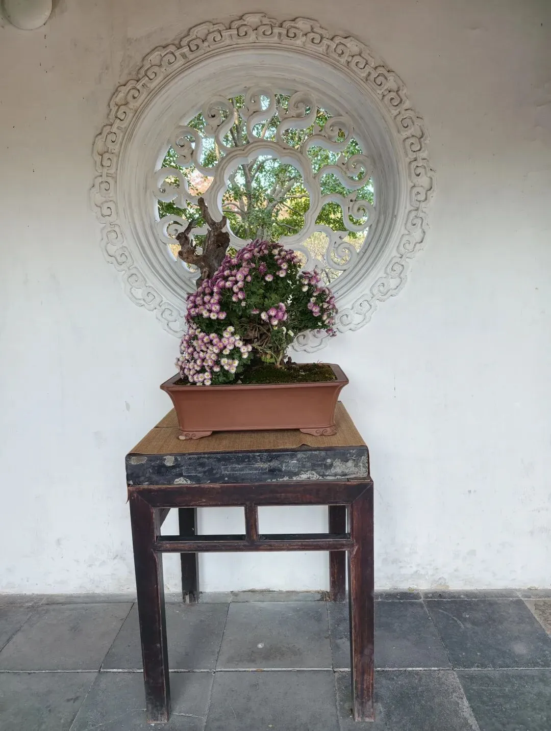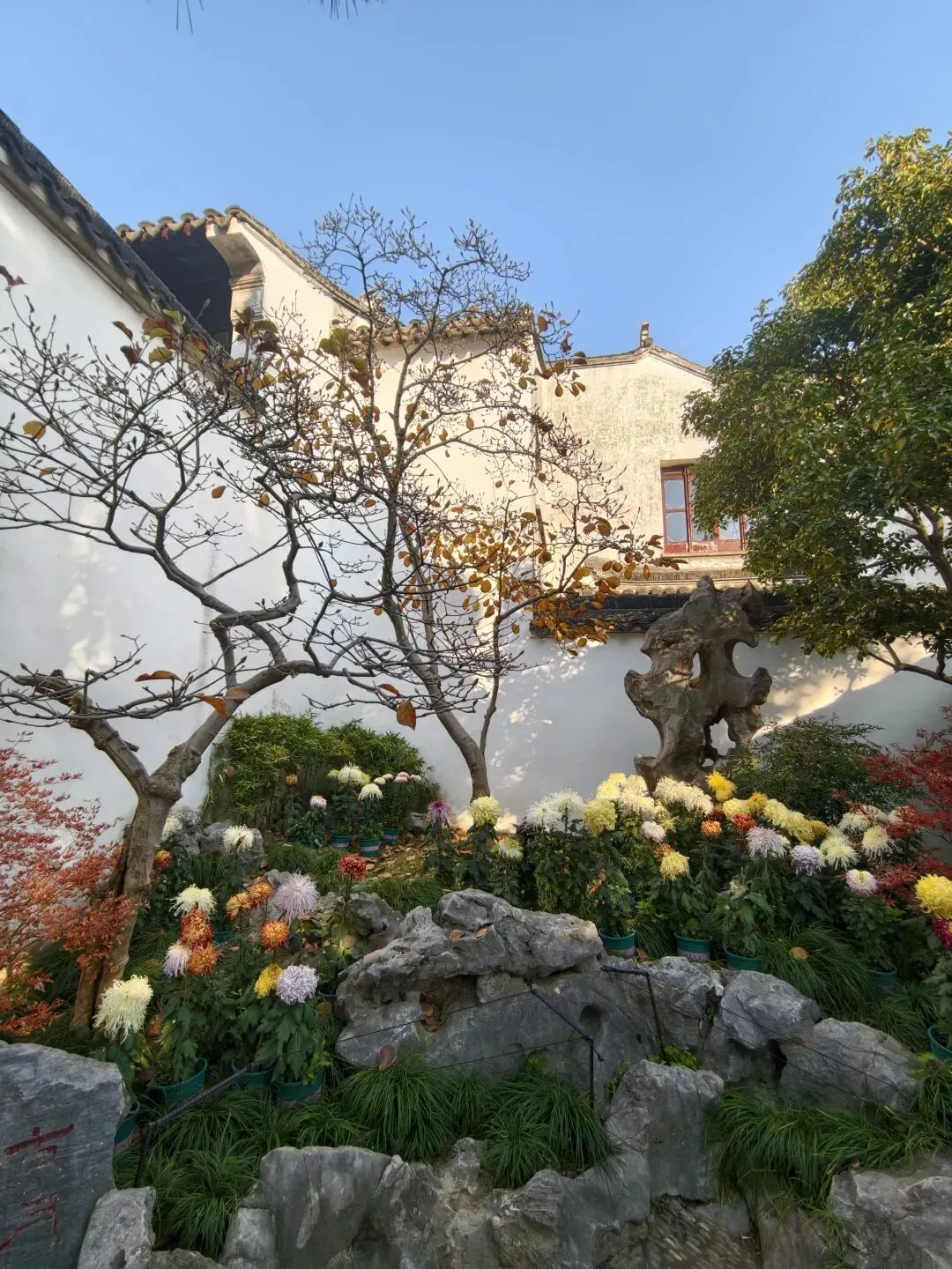 耦园中的秋色很精致。园子一角,有各色秋菊争奇斗艳;柿子树还存有稀疏的叶子,点点秋意浓;石旁的黄枫,是点睛之笔;就连晨光中的连廊,在松枝的衬托下,都透出几丝秋韵;月洞门更是被秋菊枫树青松环绕,中式园林的美感体现的淋漓尽致。 园子里摆了很多精致的盆景,这株秋菊,花朵繁茂,紫色层叠,背靠图案精美的圆窗,下面是标注有烧制人名和时间的御用黑砖,既体现中式美学,又透出中华历史底蕴。 耦园赏秋的精华,在于东西园子中的枫树和银杏,红的热烈,黄的灿烂,阳光透过枝叶,撒下斑驳光影,造出绚烂光圈,煞是好看。
