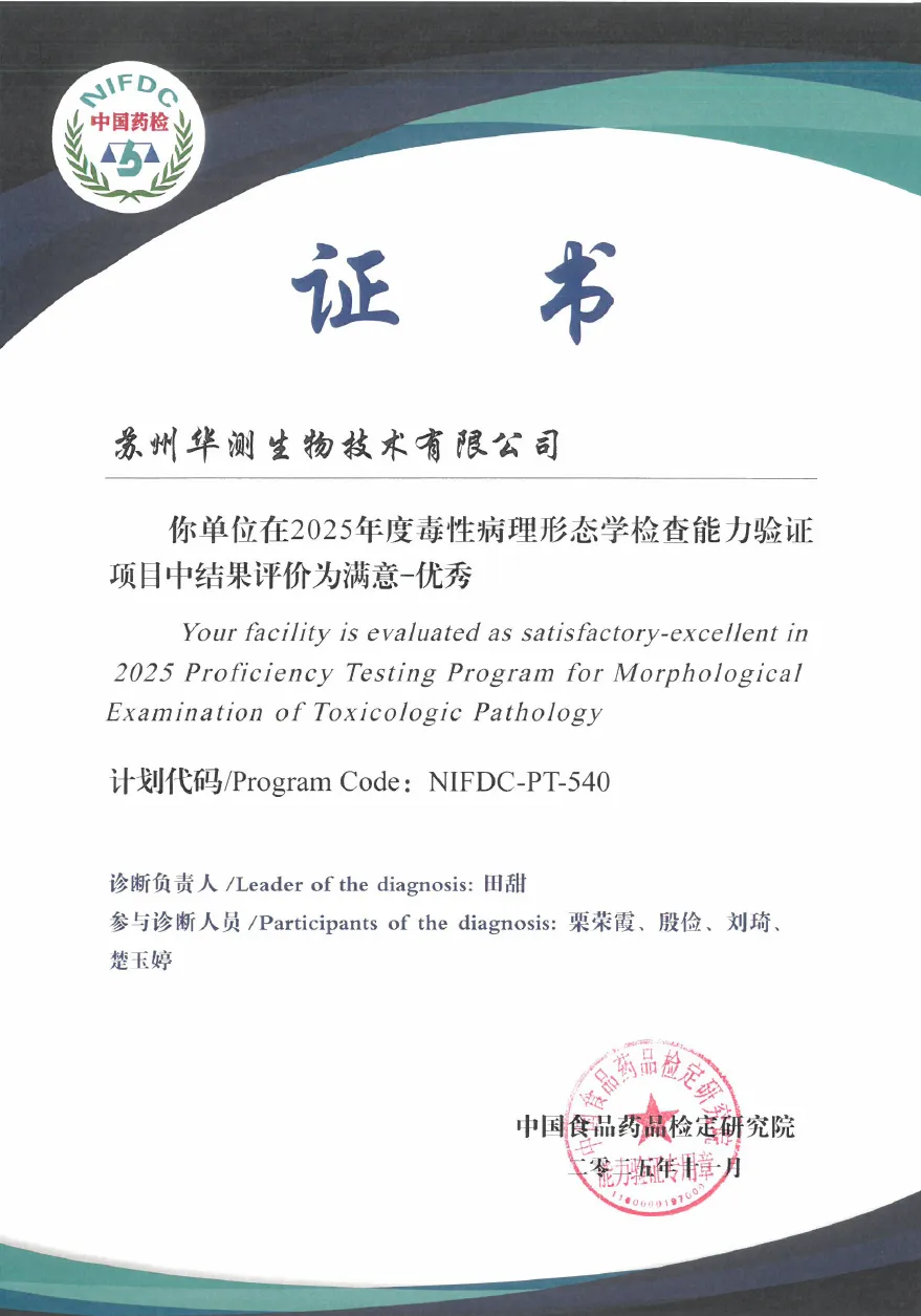 近期,在由中国食品药品检定研究院(NIFDC)组织的“2025年度毒性病理形态学检查能力验证项目”中,华测医药旗下苏州华测生物技术有限公司(以下简称:苏州华测生物)凭借专业技术实力与严谨的质量控制体系,提交的项目案例以93.25分的高分斩获全国第二名、C套方案第一名的优异成绩,获评“优秀”等级,同时成为本次能力验证中仅有的两家得分突破90分的机构之一,这一权威认证标志着公司在毒性病理检测领域的技术能力已跻身行业先进水平。