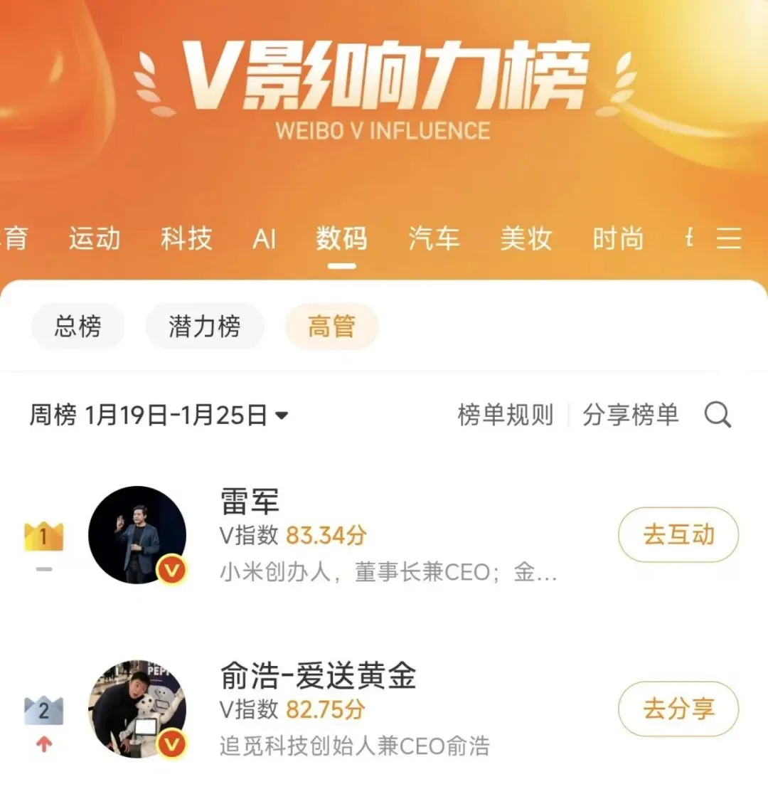 追觅科技的热度,离不开创始人俞浩的个人影响力。根据微博 V 影响力榜显示,俞浩仅用一周时间便位居数码高管榜第二名,成为名副其实的 “百万级网红 CEO”。但爆红只是他 2025 年的亮点之一:这一年,他以个人名义捐款 1 亿元成立慈善基金会,首次登上胡润慈善榜位列第九;以 85 亿元财富跻身《2025 衡昌烧坊・胡润百富榜》前 1000 名;更凭借在科技创新与行业变革中的卓越成就,当选中国新闻周刊 “影响力行业创新” 领域封面人物,成为中国智造走向世界的重要代表。从科技创业者到慈善家,从网红高管到行业标杆,俞浩的多元身份,也让追觅科技的品牌形象更加立体鲜活。