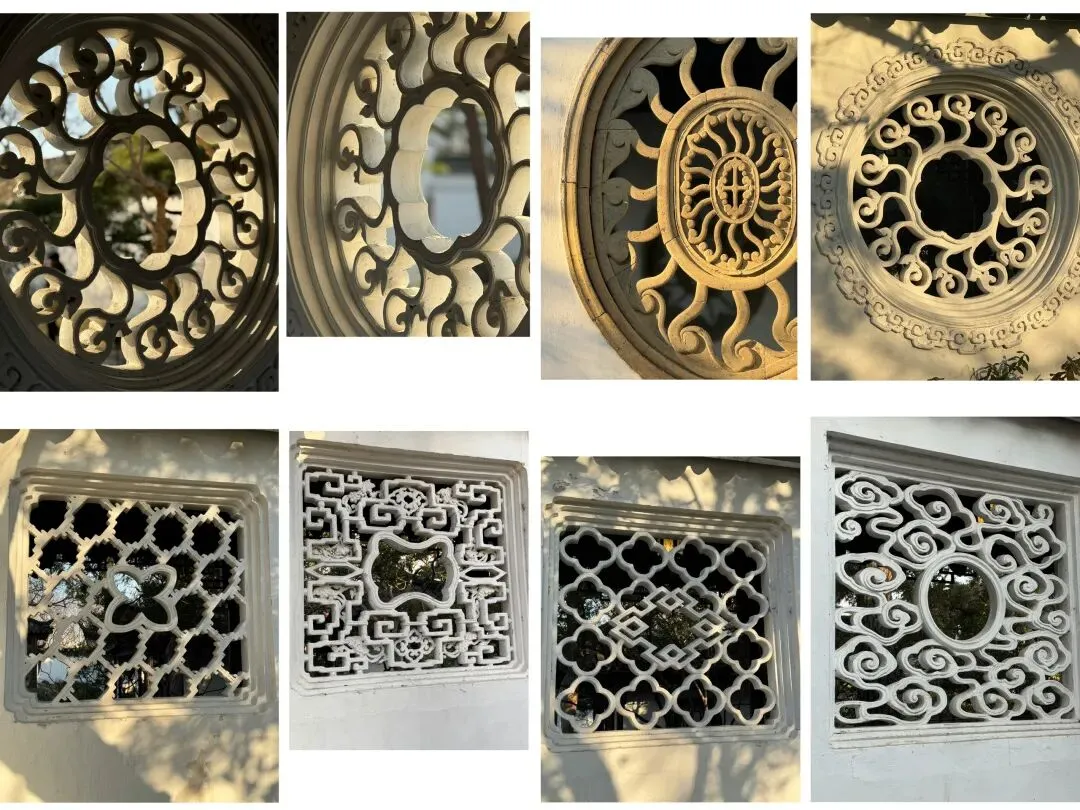 这些散落在东花园连廊和西花园里的花窗,在午后阳光下,显得立体而深邃。一扇扇花窗造型各异,这些千姿百态的纹样,让我联想起之前参观的“纹章九州”特展。眼前的这些花窗也同样传承了中华传统纹饰和纹样,蕴含着吴地先人们智慧的结晶和审美的追求。