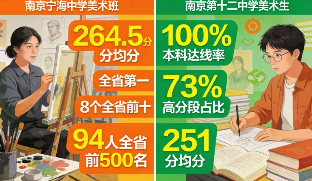 南京宁海中学美术班264.5分的均分和第十二中学100%的达线率,构成了一幅完美的升学图景,但这幅画卷上未描绘的细节,才是决定艺术生命线的关键所在。