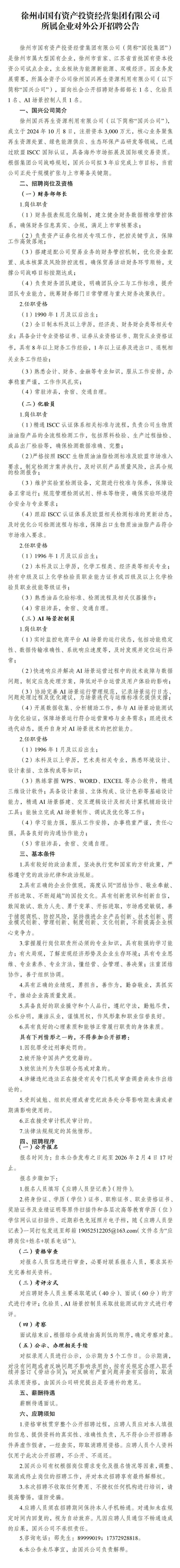 徐州市国有资产投资经营集团有限公司(简称"国投集团")是徐州市属大型国有企业,徐州市首家,江苏省首批国有资本投资公司试点企业,主业板块为能源新能源,双碳经济。因业务发展需要,所属全资子公司徐州国兴再生资源利用有限公司(以下简称"国兴公司"),面向社会公开招聘财务部部长1名,化验员1名,AI场景控制人员1名。