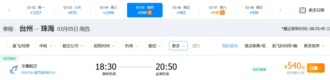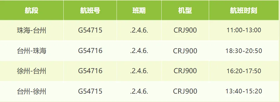 2月7日起,华夏航空台州⇋珠海、台州⇋徐州航班正式恢复,每周二、四、六执飞一班。