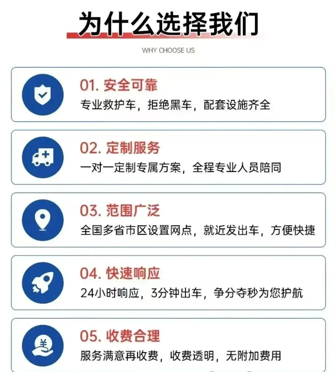 4. 安心承诺:双司机轮换确保长途安全,医疗级消毒杜绝感染,透明收费杜绝隐形消费。
