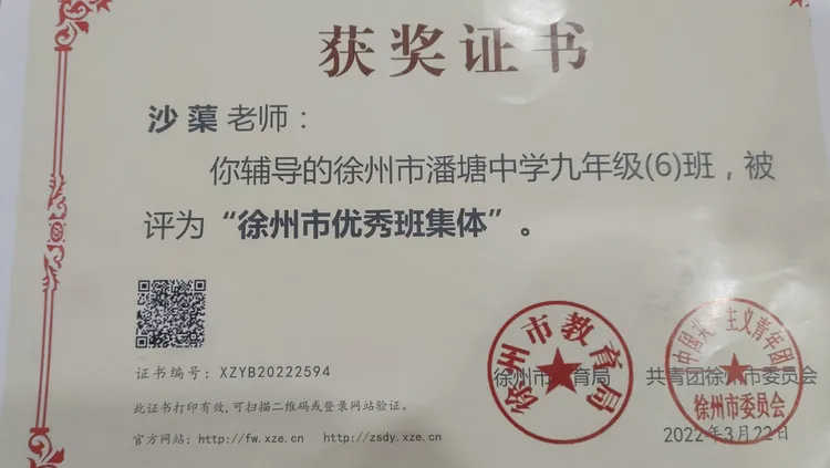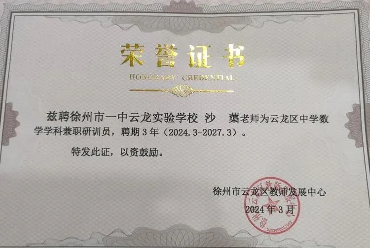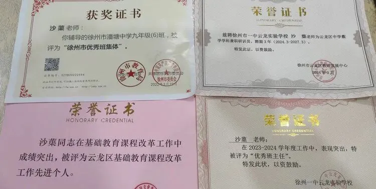 沙蕖老师的每一张荣誉证书,都是岁月沉淀的勋章。从早期指导学生拿下省数学竞赛一等奖,到连续获评市、区优秀班主任;从所带班级荣获“徐州市优秀班集体”,到受聘为云龙区中学数学兼职研训员,这些跨越不同阶段的荣誉,不仅是对她专业能力的认可,更见证了一位教育者从深耕课堂到引领区域的成长轨迹,诠释了“厚积薄发”的深刻内涵。