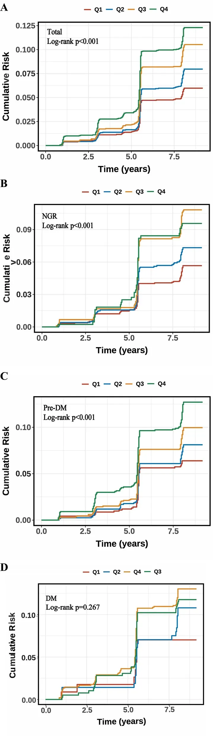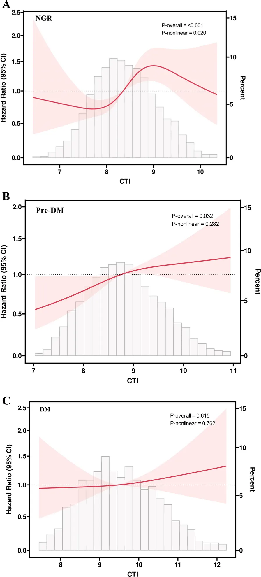 男性 NGR 群体:CTI 作为分类变量时,Q4 较 Q1 卒中风险显著升高(HR 1.67,95% CI 1.00-2.78),但连续变量分析无显著差异;Pre-DM 和 DM 群体中 CTI 与卒中风险均无显著关联