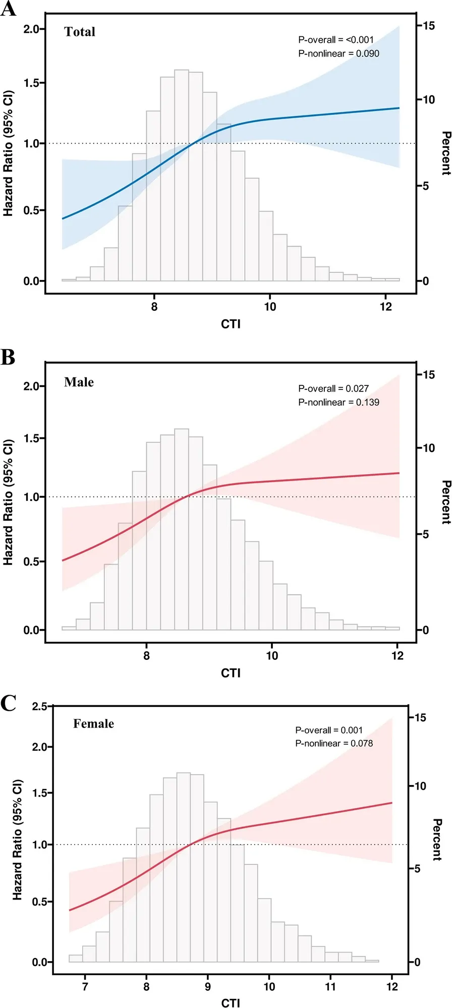 女性 CTI 每升高 1 单位,卒中风险增加 22%(HR 1.22,95% CI 1.09-1.36),男性为 15%(HR 1.15,95% CI 1.02-1.29),性别交互作用不显著(P=0.617)。