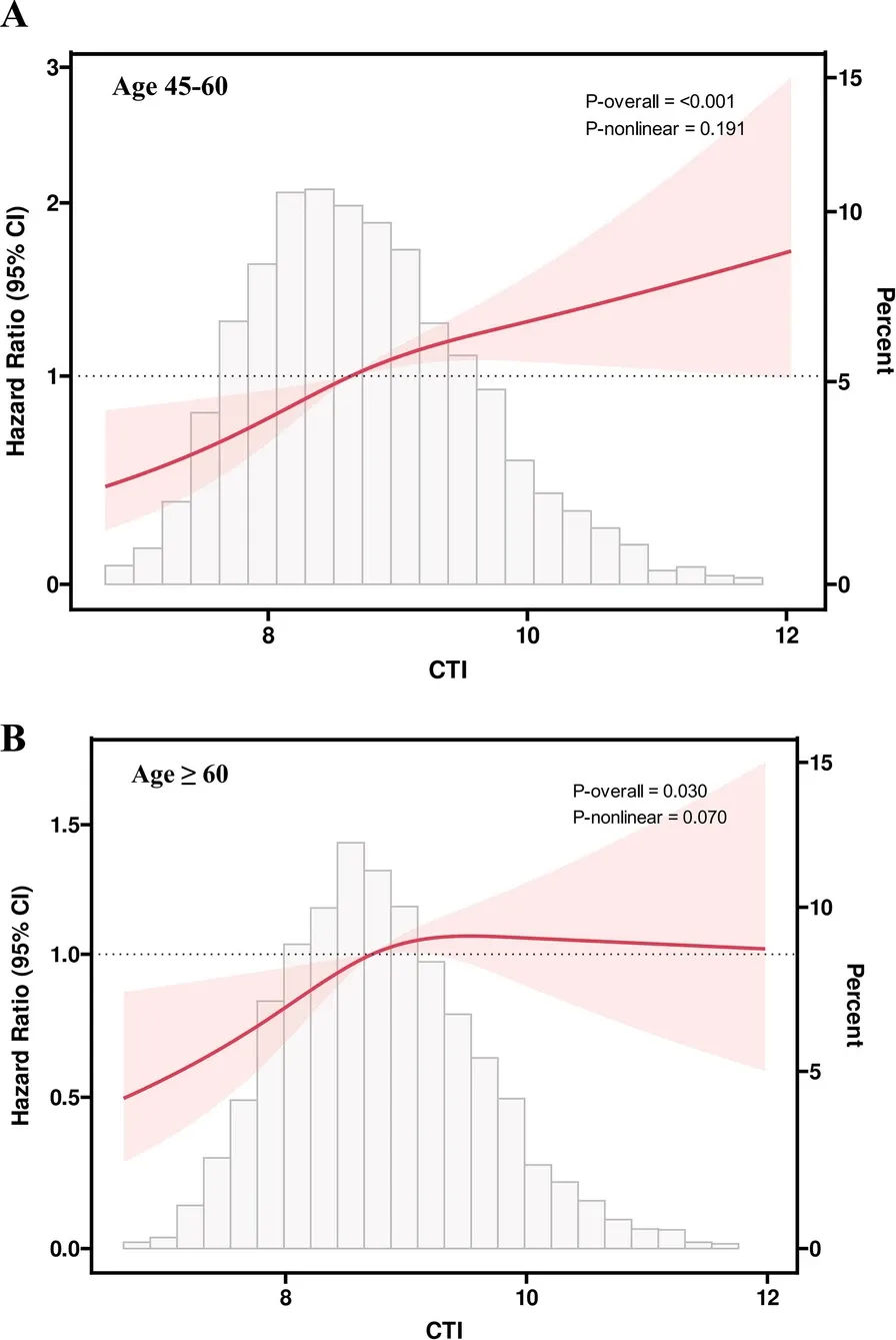 中年(45-60 岁)NGR 群体:CTI 每升高 1 单位,卒中风险增加 46%(HR 1.46,95% CI 1.11-1.91);Pre-DM 群体 HR 为 1.44(95% CI 1.16-1.80),DM 群体无显著关联。老年(≥60 岁)群体:无论 NGR、Pre-DM 还是 DM,CTI 与卒中风险均无显著关联(所有 P>0.05),且 HR 值均低于中年群体对应亚组