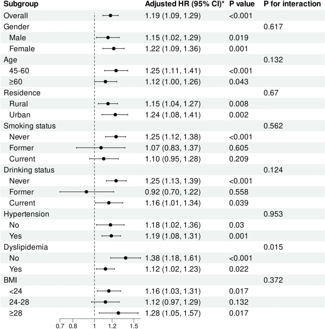 亚组分析显示,无论吸烟 / 饮酒状态、BMI 水平(<24、24-28、≥28 kg/m²)、是否合并高血压,CTI 升高均与卒中风险增加相关。