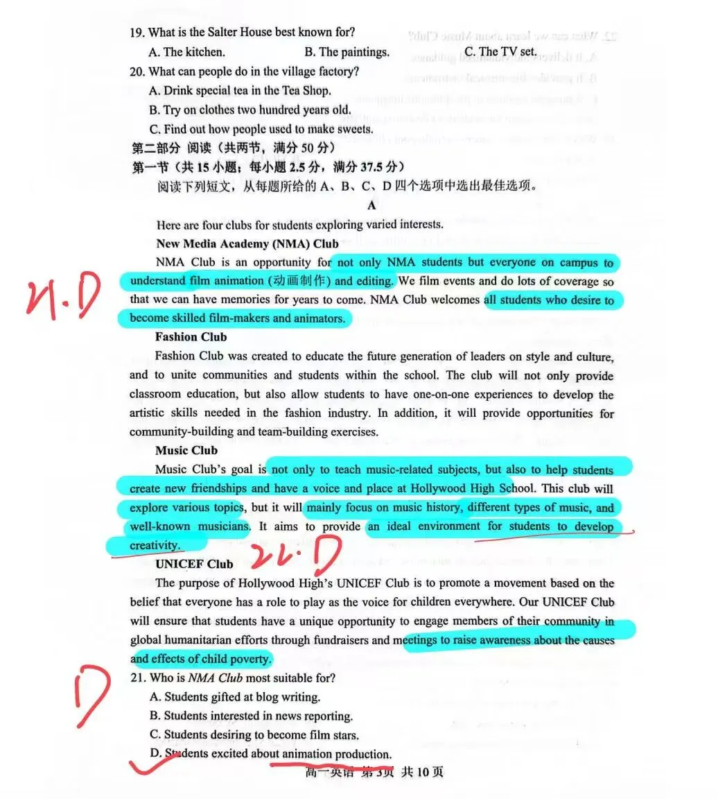 A篇阅读属于典型的应用文广告类,是一篇社团招新,整体难度不大,主要考察快速定位 + 同义替换。文章用四段分别介绍 NMA、Fashion、Music、UNICEF 四个社团的宗旨与活动内容,题目基本都能通过抓关键词直接锁定,第21题用 animation production 对应原文的 film animation,第22题Music Club真正对应的是最后一句 develop creativity,所以选D;第23题直接用 child poverty 定位到UNICEF Club。