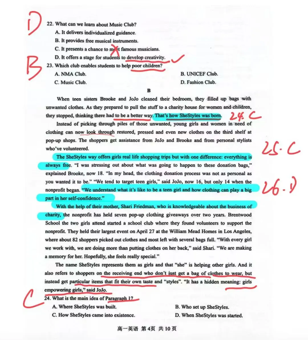 B篇阅读是一则feminism主题的人物故事类的公益新闻报道,讲的是两位少女Brooke和JoJo在整理衣物时,觉得传统捐衣的翻找成堆旧衣不够体面、也不够有温度,于是创办了公益项目 SheStyles,她们把捐来的衣服整理、熨烫甚至补充新衣,在商店里让有需要的女孩子像正常购物一样挑选,而且全程免费,还配有志愿造型师帮助搭配,传达核心理念是girls empowering girls。第24题考第一段段意(起源/如何诞生),第25题容易误选修复旧衣,但关键点其实是让受助者获得尊重与更个性化的选择体验;第26题考动机定位到文中谈到的衣服影响青少女自信,第27题属于人物品质推断,答案很容易选出善良热心。