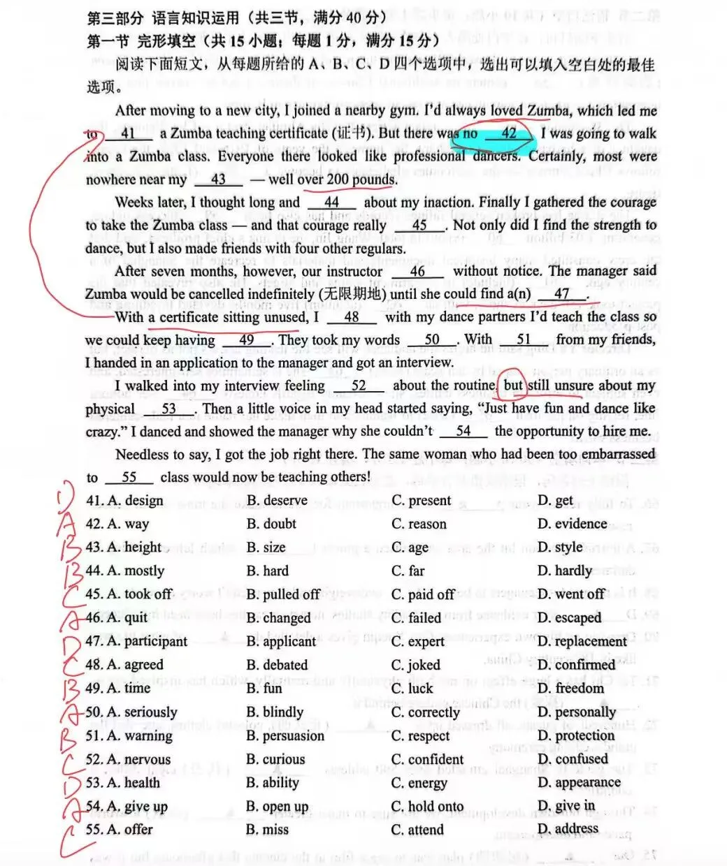 完形填空难度适中,主题为“主人公从害怕参加尊巴舞课程到成为尊巴舞老师的转变”。其中对于词组搭配的考察较多,但都比较基础。例如第45题的paid off,第54题的give up等。第46题考察到了escape和quit的细微差别,要结合前文语境,即“前尊巴舞教师突然离开”加以判断。完形选题很典型,依旧是个人成长类主题的文章。
