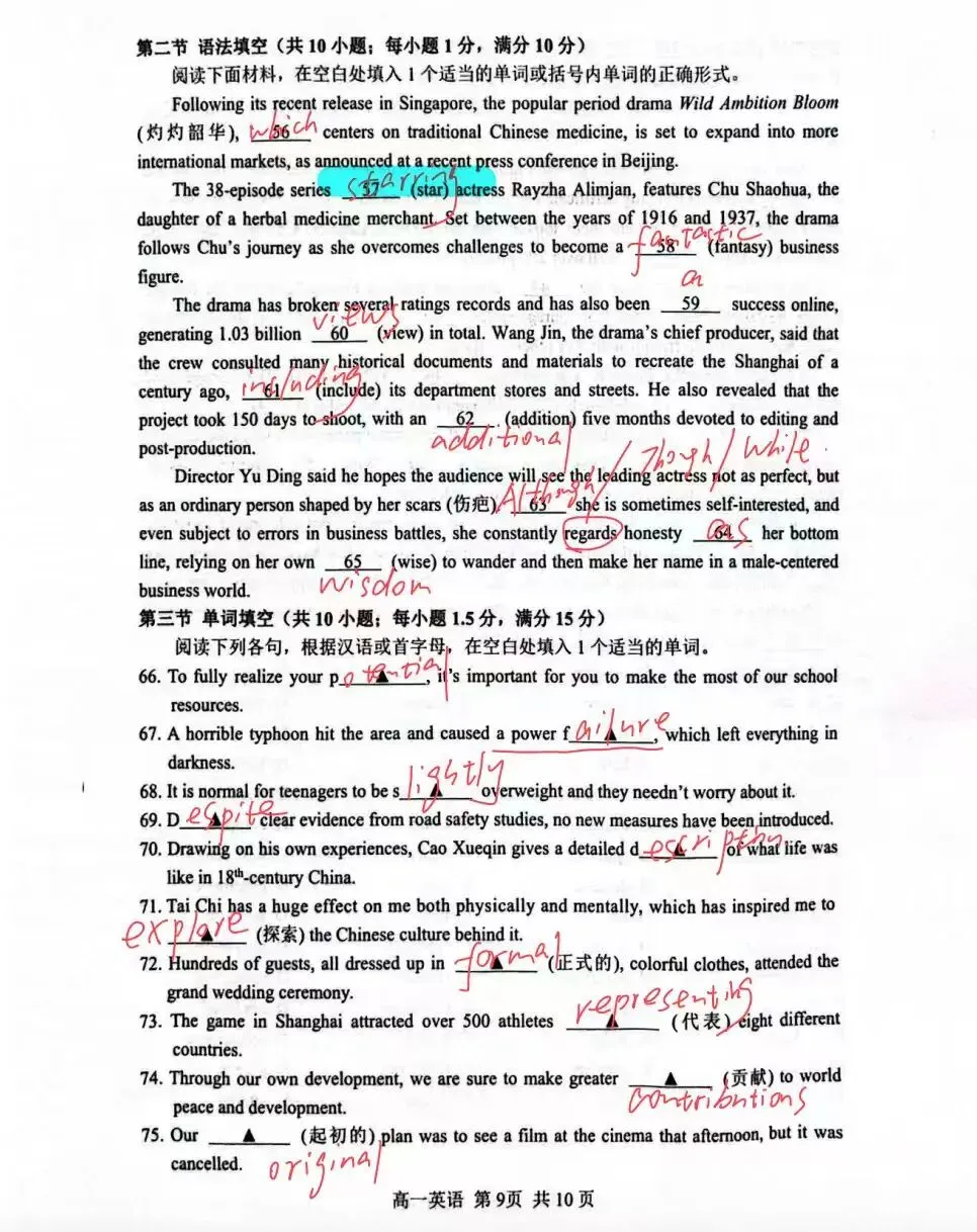 语法填空介绍了以中医药为核心的热门年代剧《灼灼韶华》的发行、剧情、播出成绩及制作细节等内容。57题比较难,句子中已有谓语动词 features,学生易忽略这一关键点,误将 star 当作谓语动词填第三人称单数stars,而正确答案是starring,因为the series与star为主动关系(star作动词译为主演,用现在分词作后置定语);60题填views,这里的view作名词表示播放量,浏览量,是可数名词,故本文用复数形式1.03 billion views 即10.3 亿次播放量;63 题考连词,需要判断出她有时自私、商战犯错和始终以诚信为底线之间的让步关系,所以填Although/Though/While;64 题考察固定搭配regard...as...