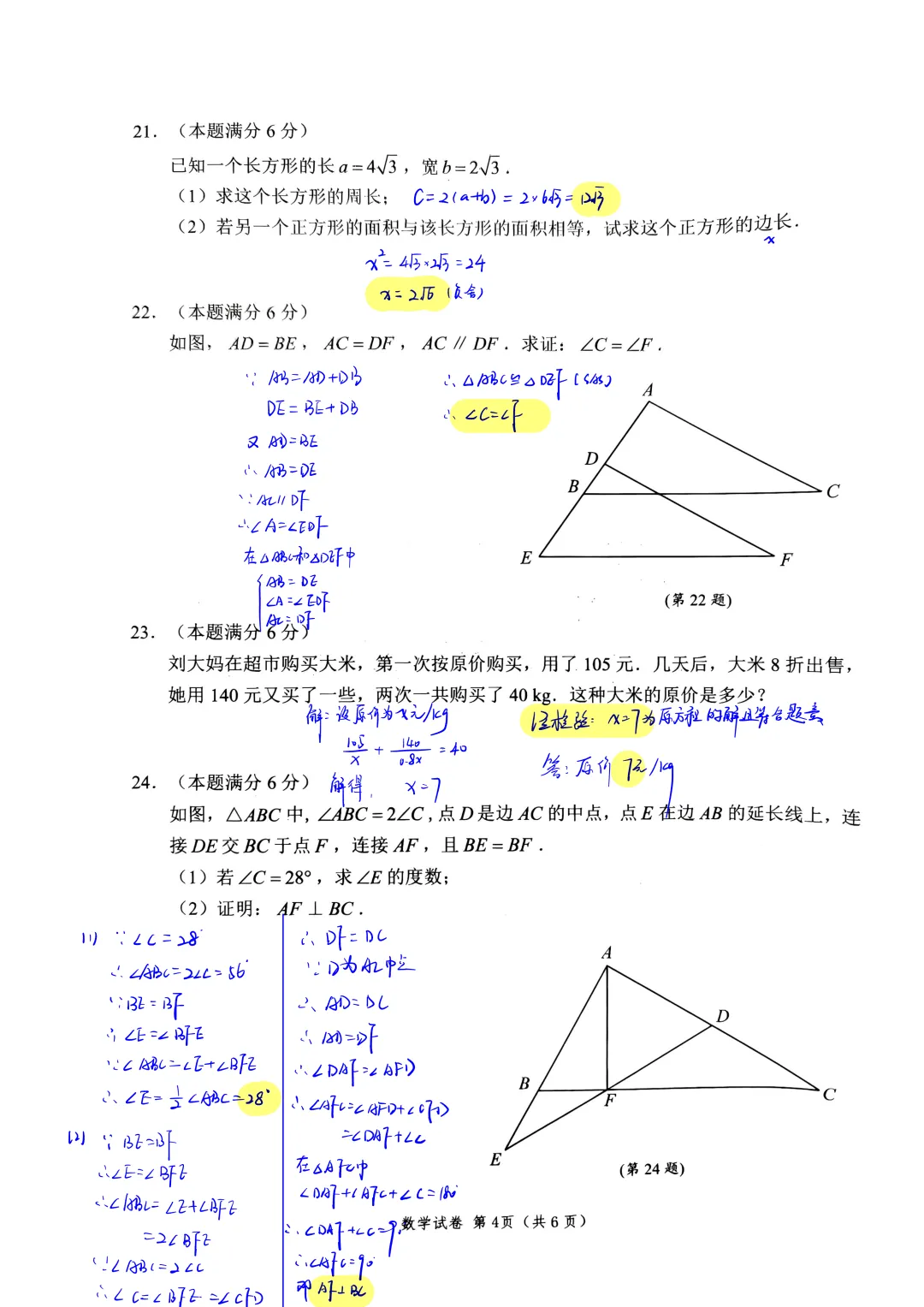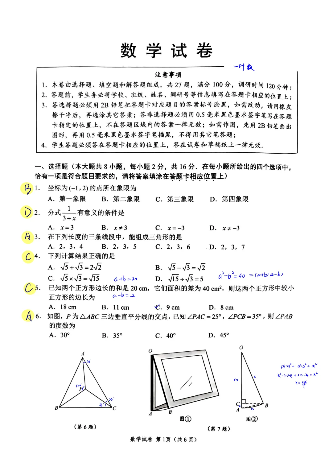 完整的解析电子版链接在文末,欢迎大家取用转发!!!最近有读者家长添加微信,为了大家可以更便捷的读到消息,也为了大家共享资料更方便,现在组建初中各年级的资料群,大家可以自由进入各自对应的年级群,有孩子们校内的练习卷也可以发在群里共享哦,有价值的资料会给孩子们整理出电子版,方便孩子们使用,欢迎大家进群分享!【分析】一份特别特别友好的试卷,友好到做到一半我重新去核实收到的试卷是否准确的试卷。考前本来也预估这次初二的数学不会很难,但是这份确实简单的有点多,这届初二小朋友的几次统考试卷都不是很难,分数都有些高,对大部分基础小朋友来说还是要抓好基础,小朋友们都可以快乐的过一个好年。作为新版本的第一届考生,每次统考的难度都有限,月考校内下手又比较重,对大家来说还是挺割裂的,对于难卷孩子们的应对能力也相对有限,大家也还是要适当注意日常一些难题的积累。区分度很小,速度快的小朋友一小时左右可以结束试卷,会有很多时间检查和思考,唯一稍微有些难度的填空最后一问可以作为一个区分题,但是时间充足,是有不少时间可以思考这道题的求解的,主要就是辅助线的构造,内部角无非常特殊的角,只能借助60度构造,只给了BC边,肯定要借助全等转化边。