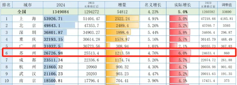 2024年,苏州以26727亿元的数据高居全国第六,2025年数据暂时还没出来,但不影响排名。