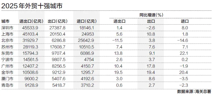 从海关总署公布的数据看,2025年全国外贸十强城市分别为:深圳、上海、北京、苏州、东莞、宁波、广州、金华、厦门和青岛。