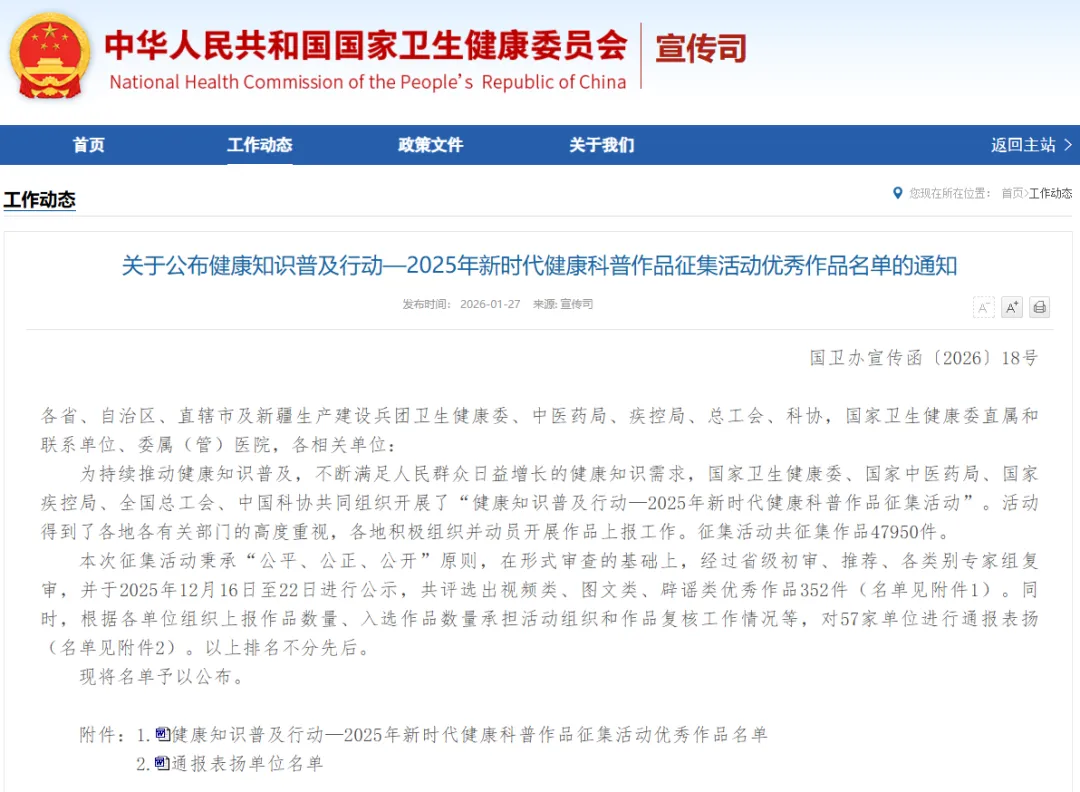 近日,由国家卫生健康委、国家中医药局、国家疾控局、全国总工会、中国科协共同组织开展的“健康知识普及行动——2025年新时代健康科普作品征集活动”优秀作品评选结果揭晓,共评选出视频类、图文类、辟谣类优秀作品352件。我市有两件作品光荣上榜!