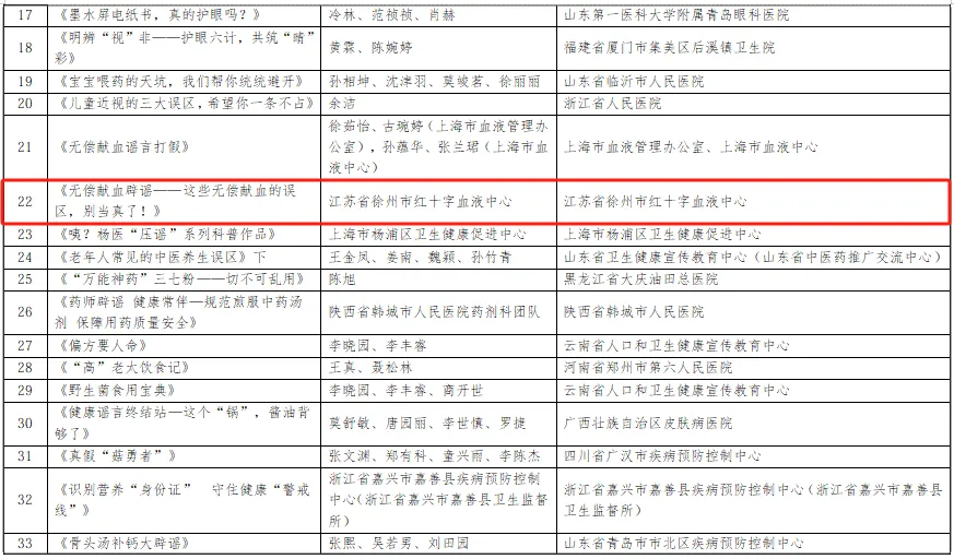 徐州市红十字血液中心选送的科普视频——《无偿献血辟谣—这些无偿献血的误区,别当真了!》获评为辟谣类优秀作品。