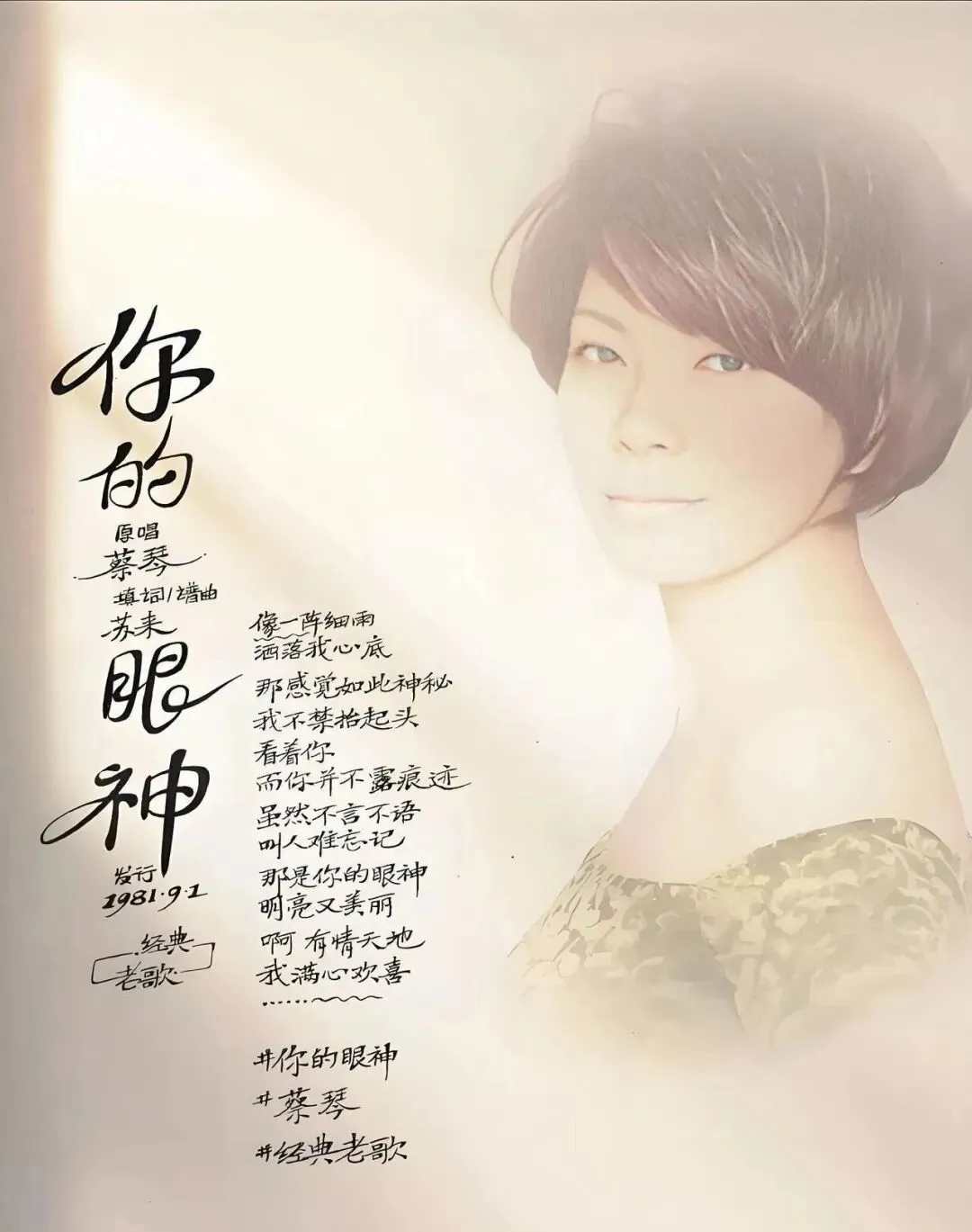 蔡琴独特的嗓音就像一阵细雨撒落心底,那感觉如此神秘,牵动着每个听者的心弦。《你的眼神》好像是从她的心里流出来,如此动人传神。