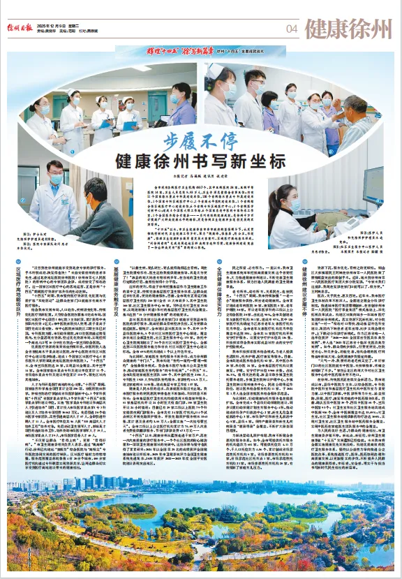 “十四五”以来,健康徐州从蓝图走进千家万户,落在一次次高质量的诊疗服务中、一个个社区医院的贴心随访里和一项项卫生健康领域的突破中。这份深耕与坚守也获得了累累硕果:2024年以全国第25名的成绩获评全国健康城市建设样板市,2025年市卫健委被评为全国卫生健康系统先进集体,2025年获评2022—2023年度全国平安医院建设表现突出地区。