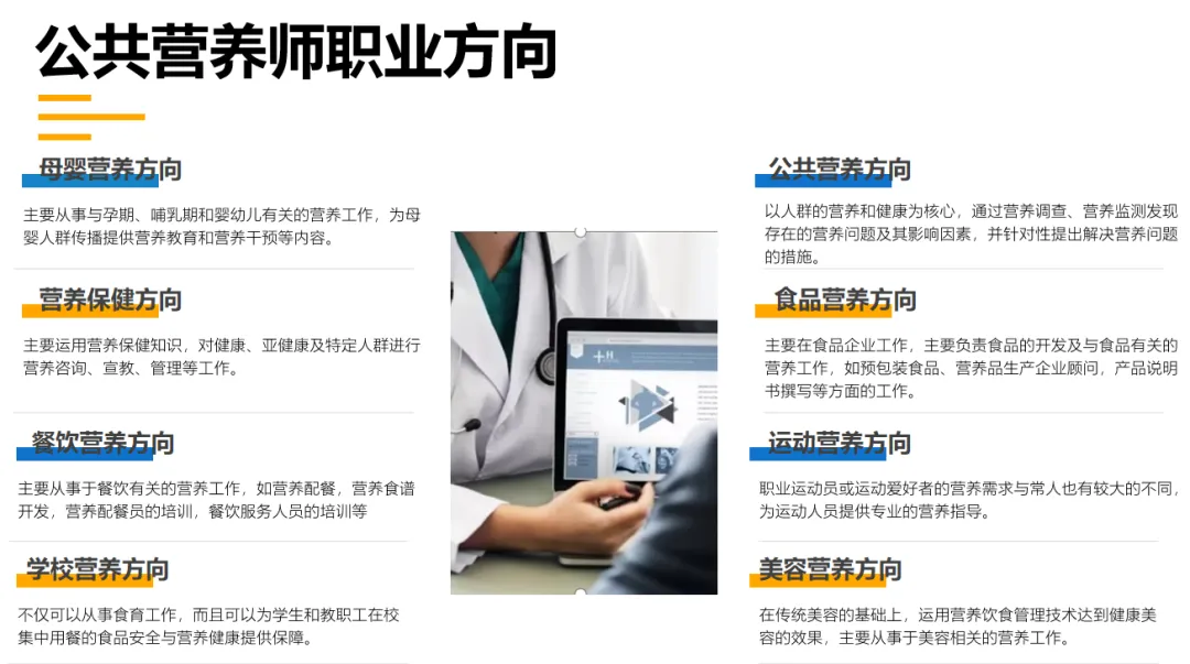 公共营养师是国家人社部颁布的第4批新职业之一。是应社会、市场的需要而产生的职业技能人才,指接受专业知识技能培训,从事人群膳食状况的评价与指导、营养与食品知识传播,促进社会公共健康工作的专业人员。