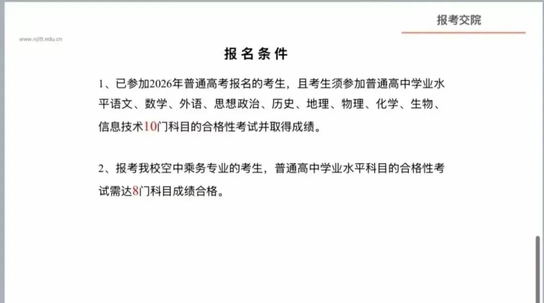 2、报考我校空中乘务专业的考生,普通高中学业水平科目的合格性考试需达8门科目合格.