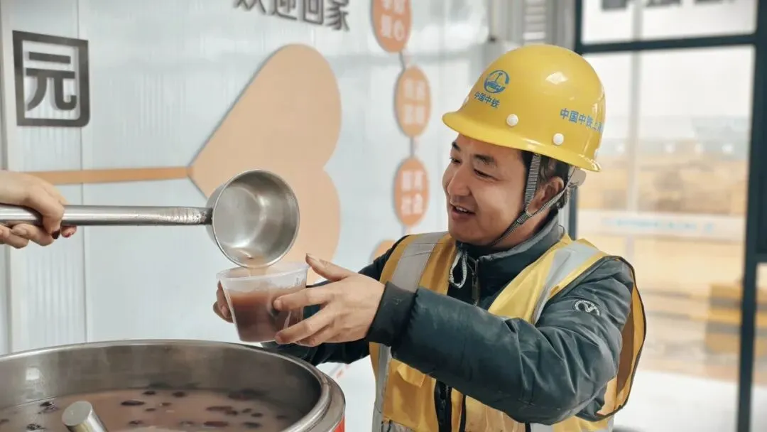 送福环节结束后,项目工会青年志愿者与属地永宁街道高丽社区志愿者们迅速分工,将精心熬制数小时的腊八粥细心盛入碗中。红枣、桂圆、莲子、糯米等食材熬煮而成的粥品,软糯香甜、热气腾腾。志愿者们双手将粥碗递到每一位工友手中,一句句“师傅,辛苦了!趁热喝碗粥暖暖身子”的真诚问候,如同冬日暖阳驱散寒意。工友们接过腊八粥,脸上洋溢着朴实的笑容,纷纷感慨:“这碗粥喝在嘴里,暖在心里。不仅感受到了腊八节的节日氛围,更体会到了项目部的牵挂,让我们在异乡务工也能感受到家的温暖。”