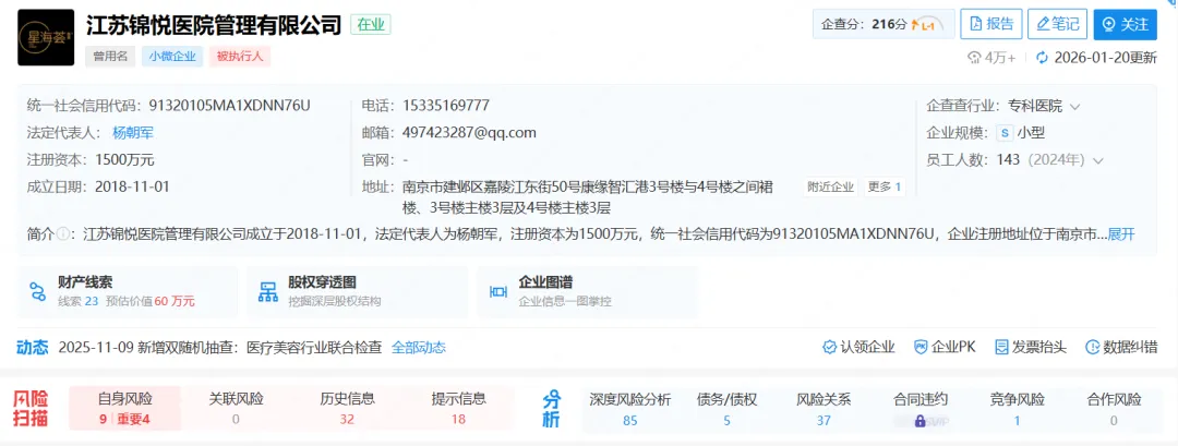 南京锦悦美容医院隶属于江苏锦悦医院管理有限公司,成立于2018年,实缴资本1500万人民币。