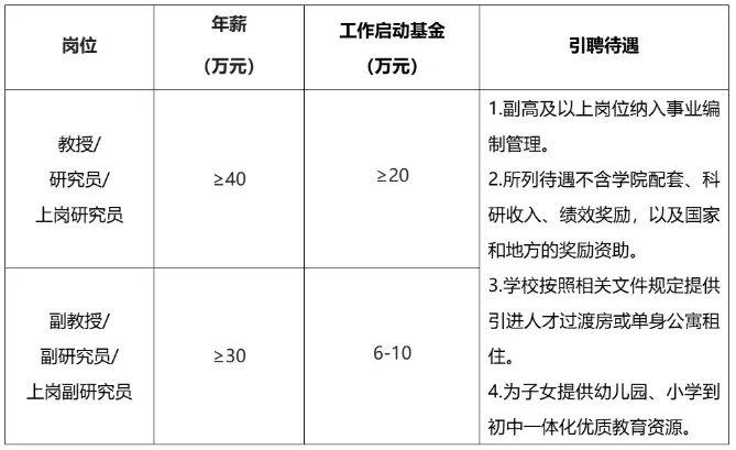 研究员序列纳入事业编制,具有硕导/博导申报资格;各级岗位基础年薪不含科研收入及绩效奖励;学校按照相关文件规定提供引进人才过渡房或单身公寓租住;为子女提供优质教育资源。相关具体信息详见: