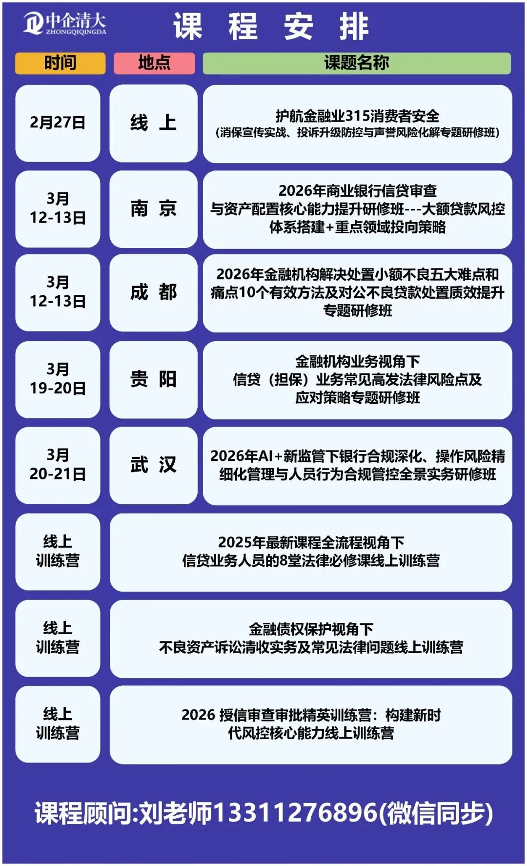 本次研修班立足银行信贷业务全流程,以近三年真实信贷案例为依托,深度融合大额贷款专业化审查体系与 2026 年资产配置前沿策略。课程既覆盖信贷调查审查核心内容、财务报表深度解读、担保方式风险把控等基础能力模块,又聚焦政信业务、科创企业、普惠零售等重点客群,以及战略性新兴产业、传统行业转型等关键领域的投向选择与风险洞察。旨在帮助参训学员构建 “体系化审查思维 + 精准化配置能力”,破解大额贷款、集团客户授信难点,应对监管检查焦点问题,实现信贷业务合规发展与风险可控的双重目标,为银行精细化信贷管理与专业化团队建设筑牢基础。