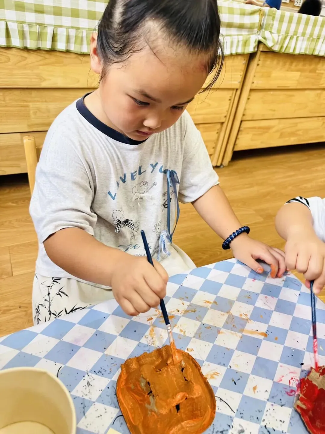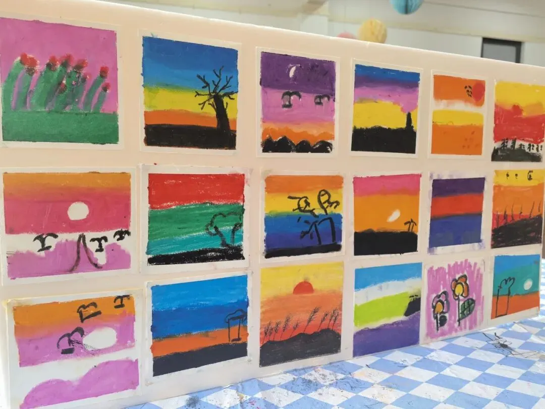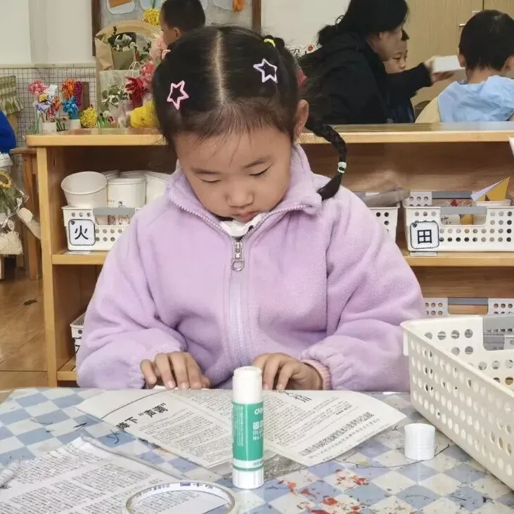 秋日小屋手工活动中,孩子们循着“染色——剪裁——拼贴”的创作脉络,先将白色纸喷染成温暖橙色,再把报纸剪出圆形并剪贴成屋顶,最后用黑白卡纸制作小屋并拼贴在其上。在这个过程中,孩子们感受到了色彩搭配的美感,并锻炼了剪裁、粘贴等动手技能,通过变废为宝的实践,感受到了秋日氛围。大家在沉浸式创作中激发了对自然季节的观察与热爱,也收获了满满的创作成就感。